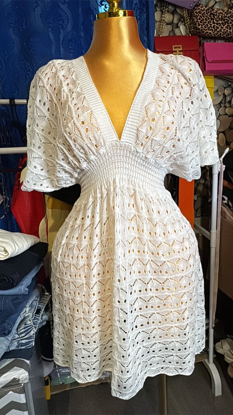 Selling a cute white crochet mini dress! It features a V-neck and short sleeves. Perfect for a casual day out or a beach cover-up