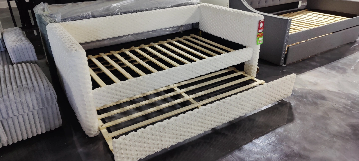 Selling a comfy white daybed that comes with a trundle! The frame is a light wood color with a black base. The daybed is upholstered with a white, soft, textured material. It's in great condition and ready for a new home