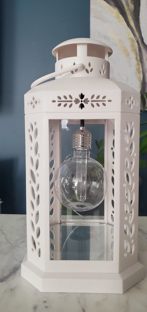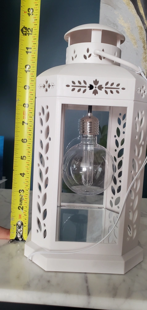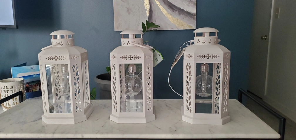 This is a lovely white decorative lantern, perfect for adding a touch of warmth to any room! It measures approximately 12 inches in height and has a unique design. I'm asking for $15 each or best offer.