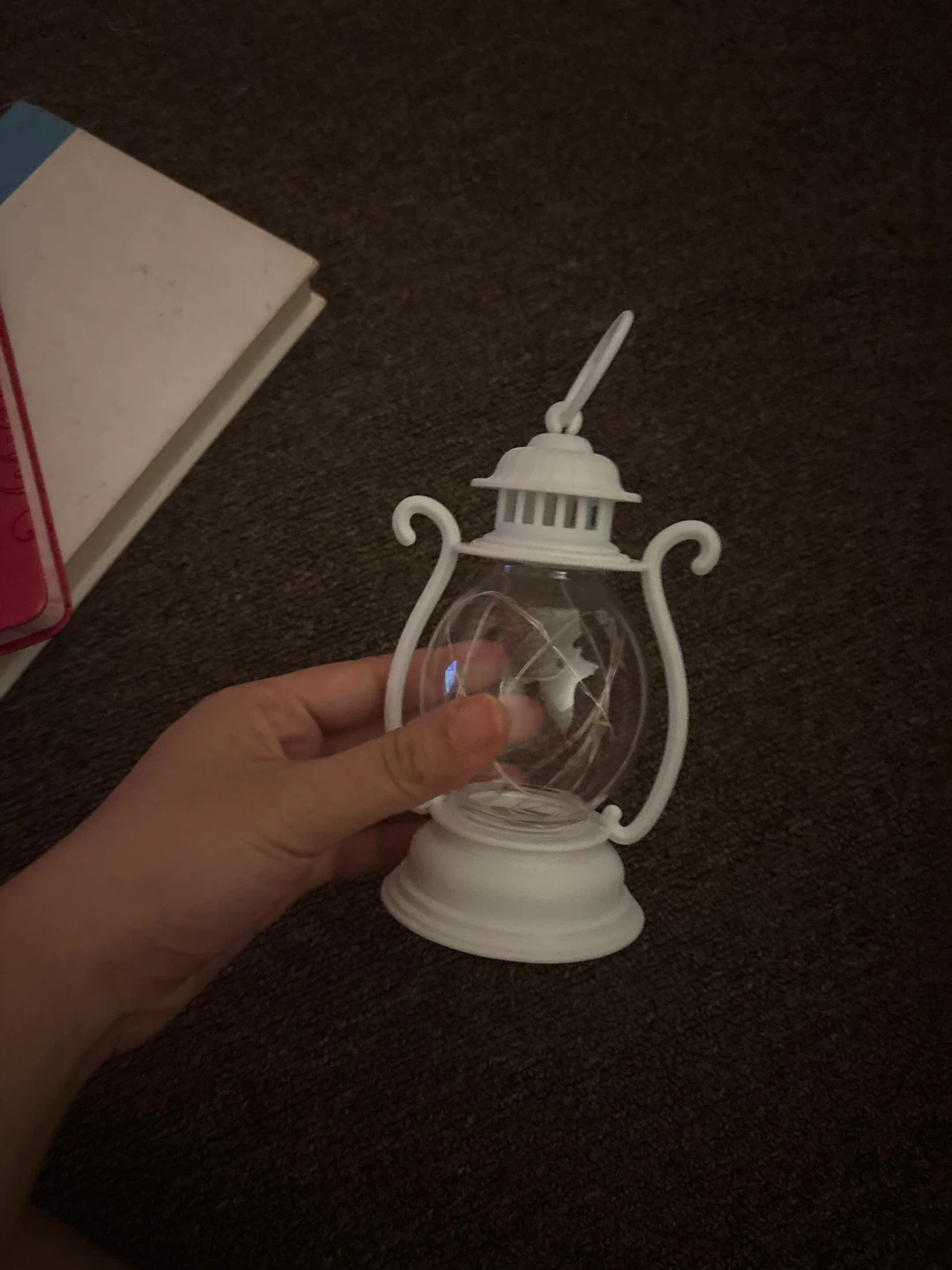 This is a cute white decorative lantern. It's perfect for adding a touch of whimsy to any room. It's in great condition and ready to light up your space!