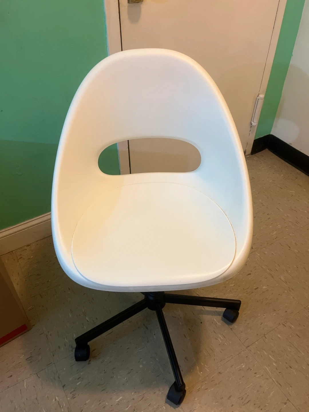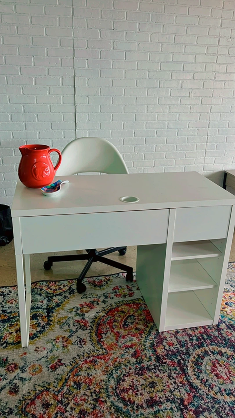 Selling a simple white desk with a matching chair. The desk has a drawer and shelving on one side. The chair is a comfortable white swivel chair. Perfect for a home office or student! Rug for sale as well make an offer!