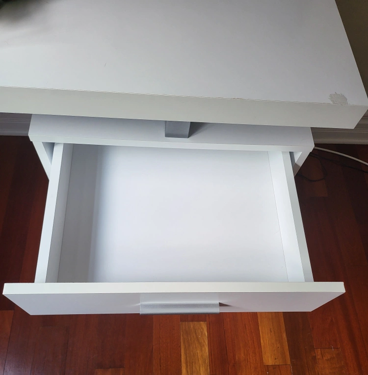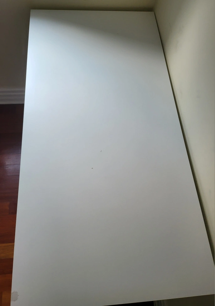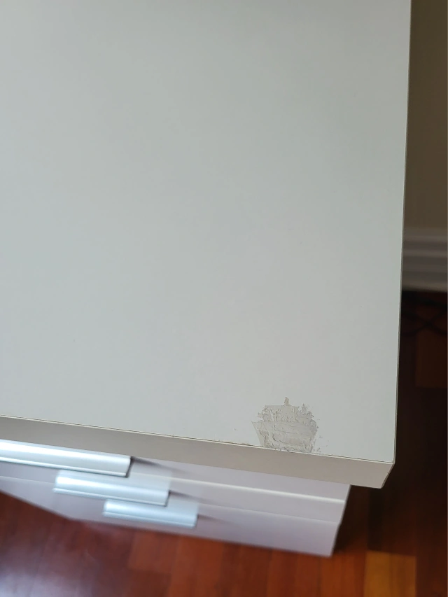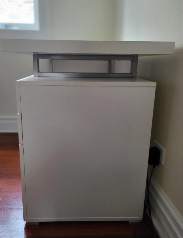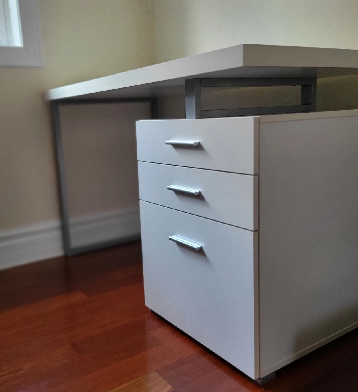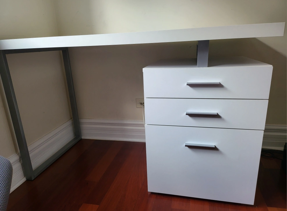 68Chicago 》Item for pickup 《 Selling a white desk with attached drawers. Whether you're left- or right-handed, the reversible setup and sleek pull handles make this small computer desk a smart and modern choice. There are some signs of wear, as shown in the pictures. Perfect for a home office or study space!