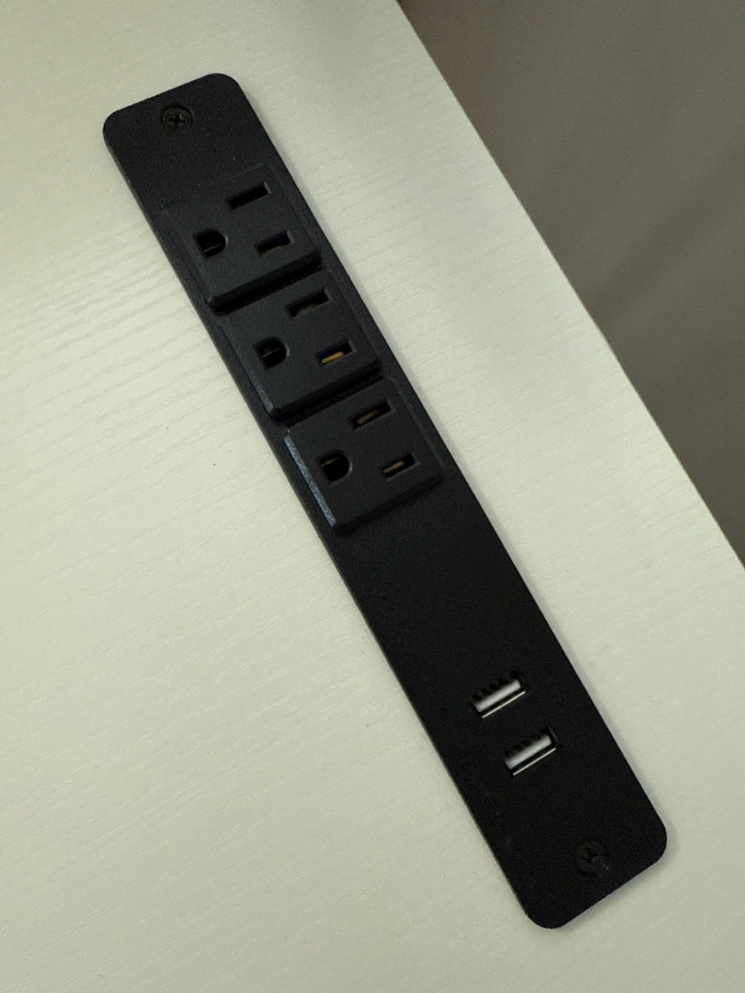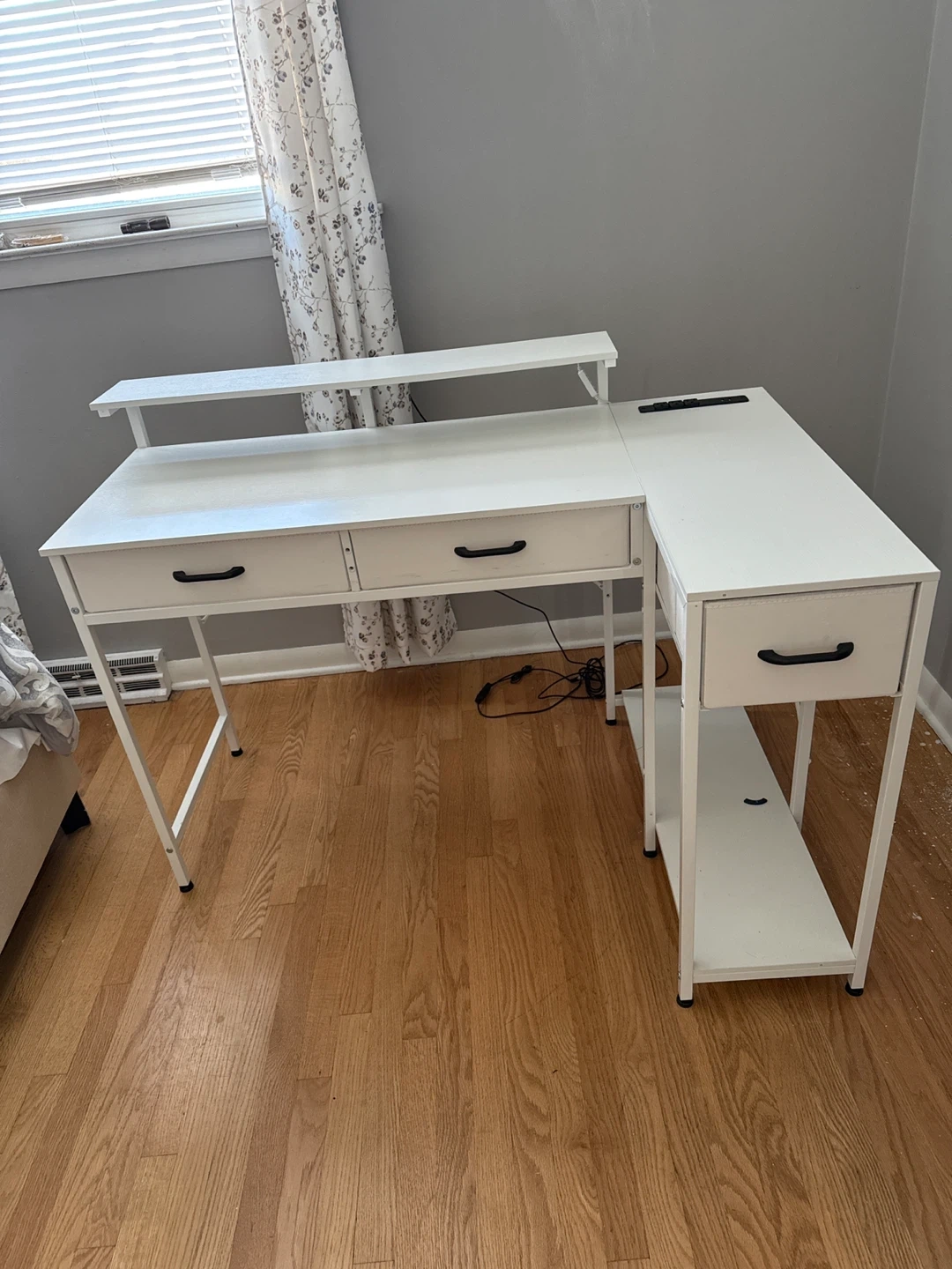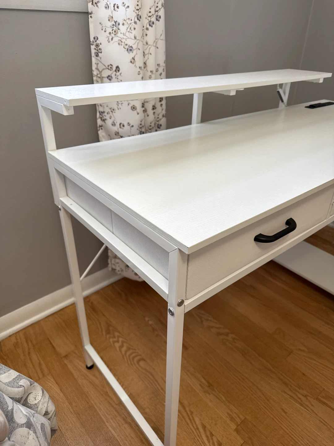 Selling a desk in great condition! It's white with a shelf on top and convenient drawers for storage. It also has a built-in power strip with USB ports, perfect for keeping your devices charged and ready to go