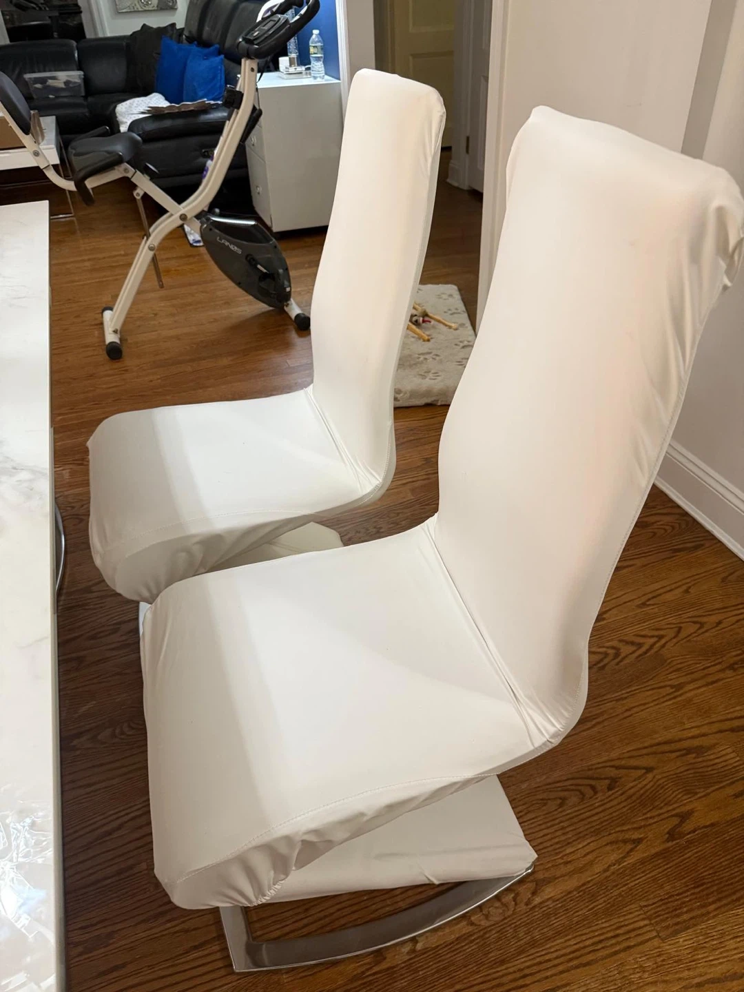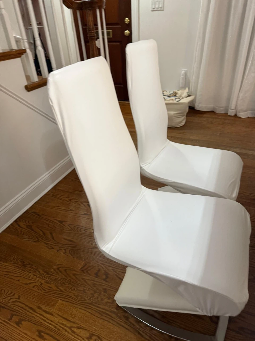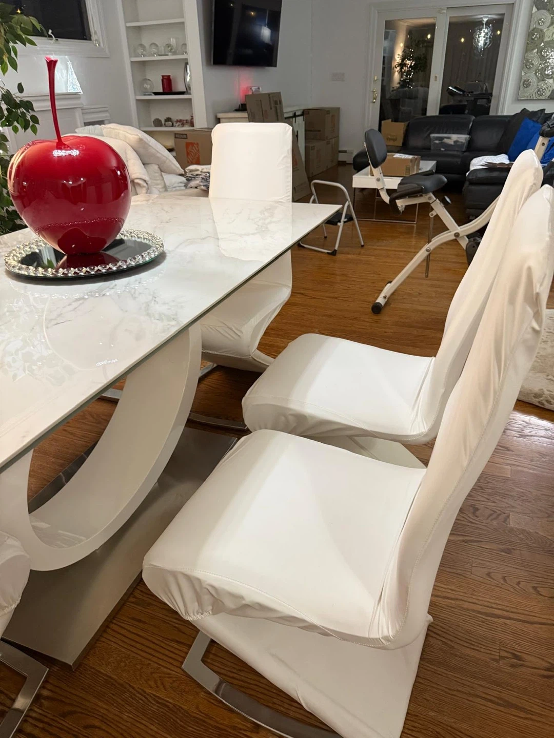 15Selling a set of four white dining chairs. They're in great condition and would look lovely in any dining room or kitchen. The chairs have a sleek, modern design with a comfortable seat. Perfect for adding a touch of elegance to your home!