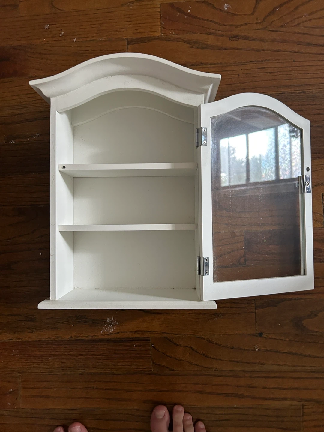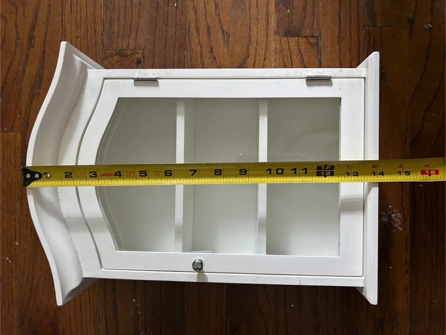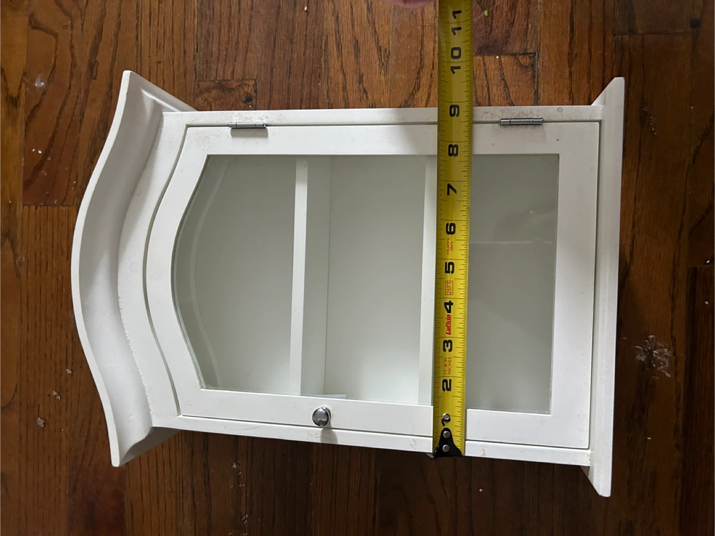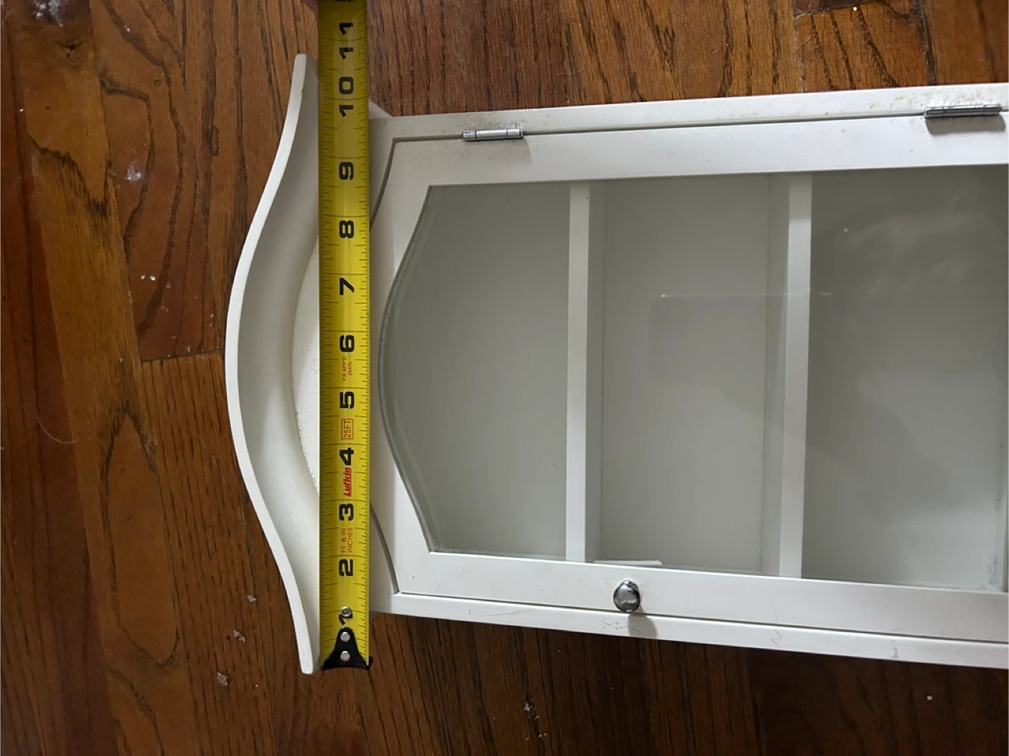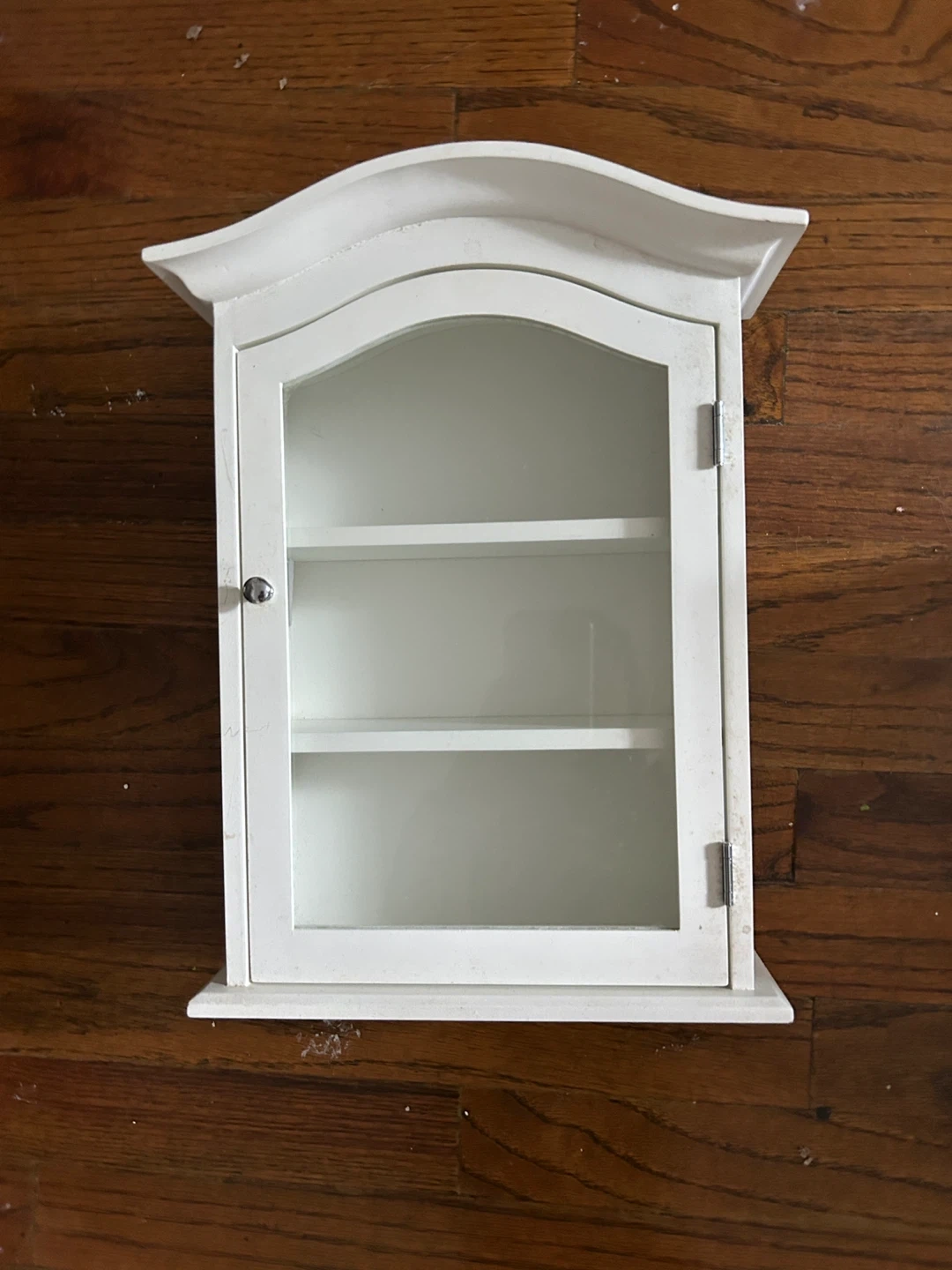 Selling a cute white cabinet with a glass door! It has two shelves inside, perfect for a small bathroom or any room needing extra storage. The cabinet is in good condition and ready for a new home. See pictures for measurements.