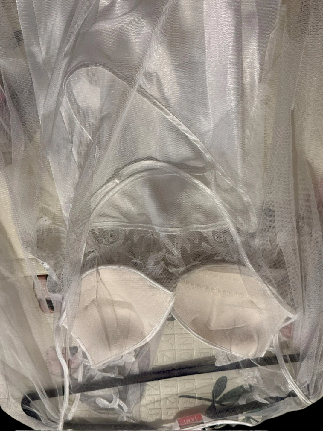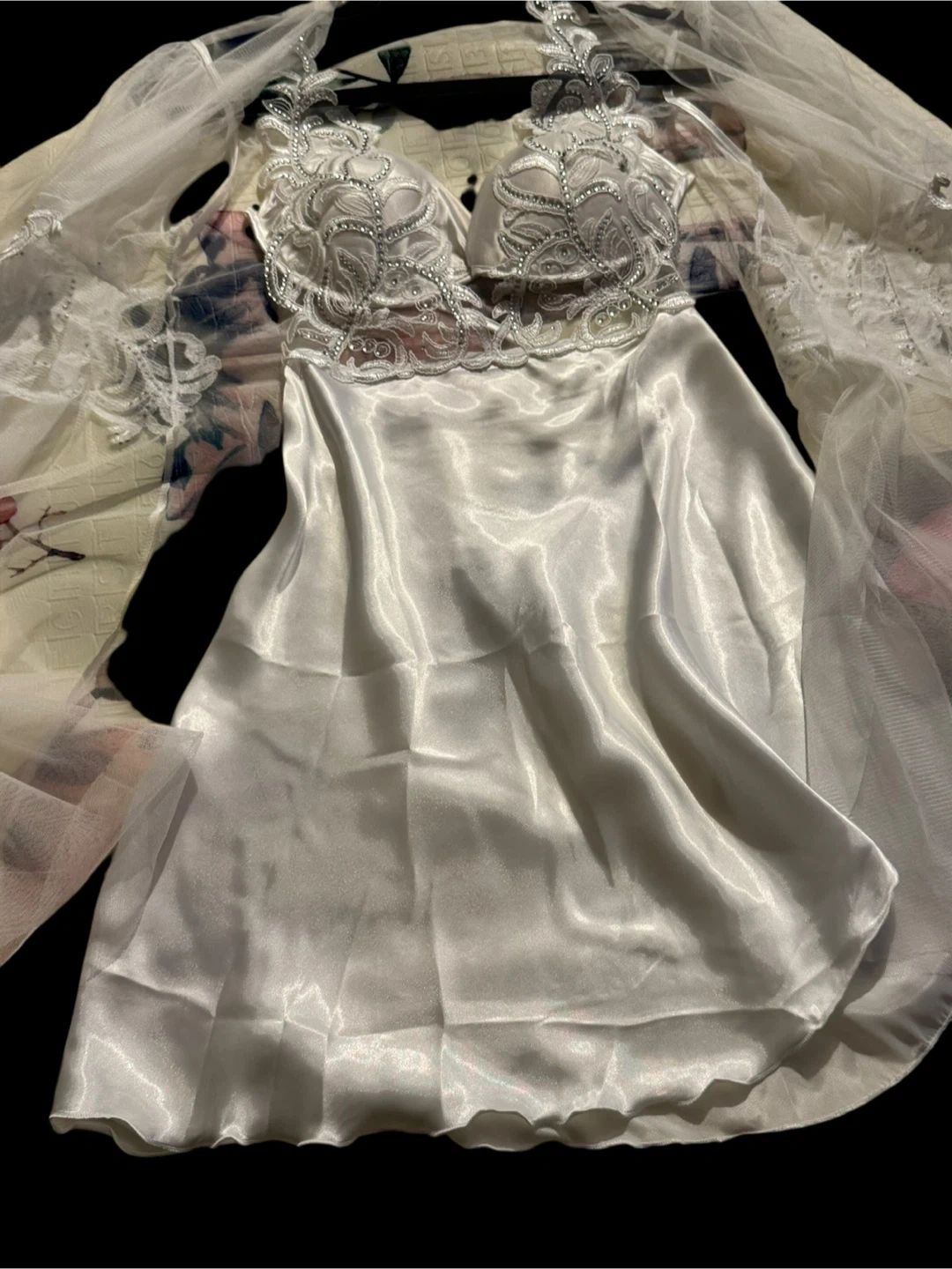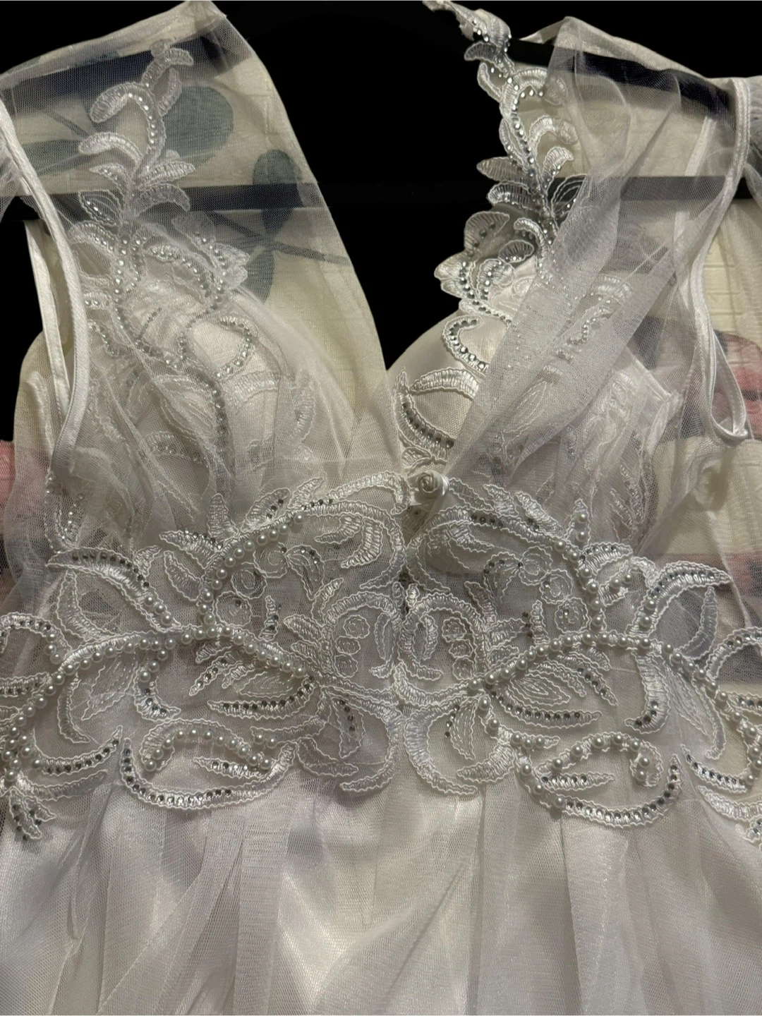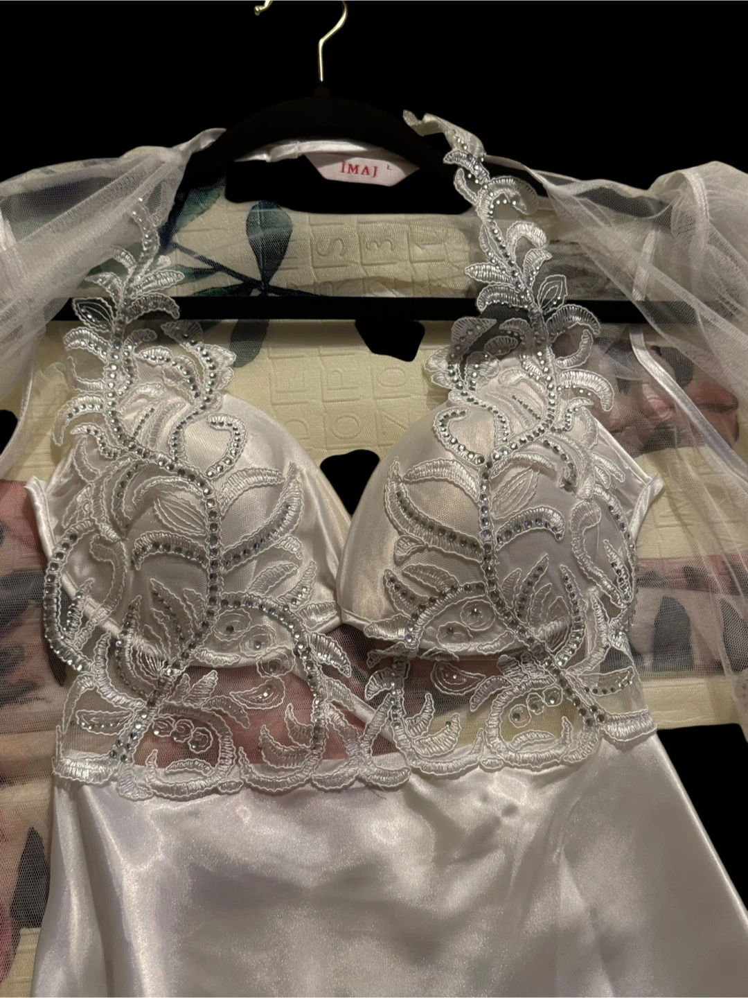 This is a white lingerie dress with delicate embellishments and a sheer overlay. It appears to be in good condition and features intricate detailing on the bodice and sleeves. Perfect for adding a touch of elegance to your wardrobe!