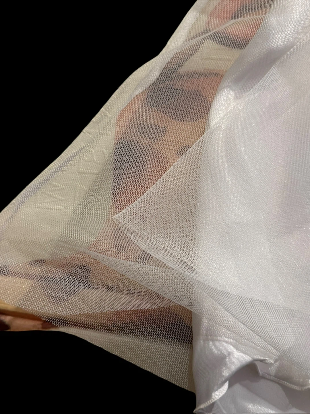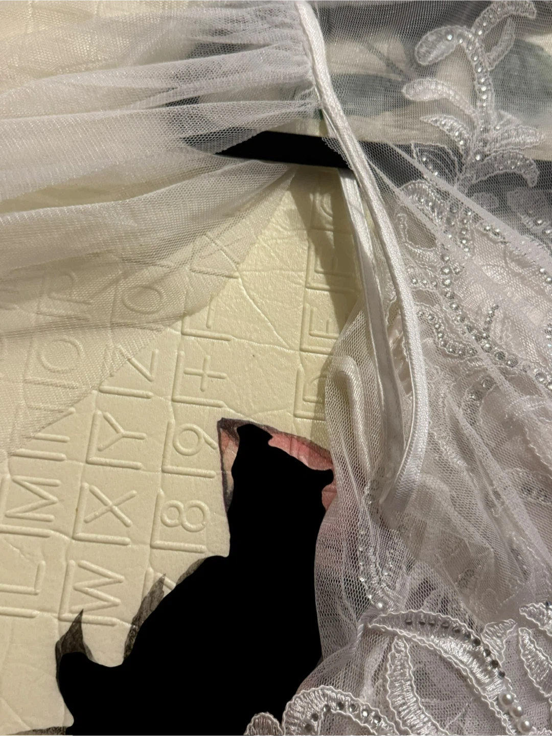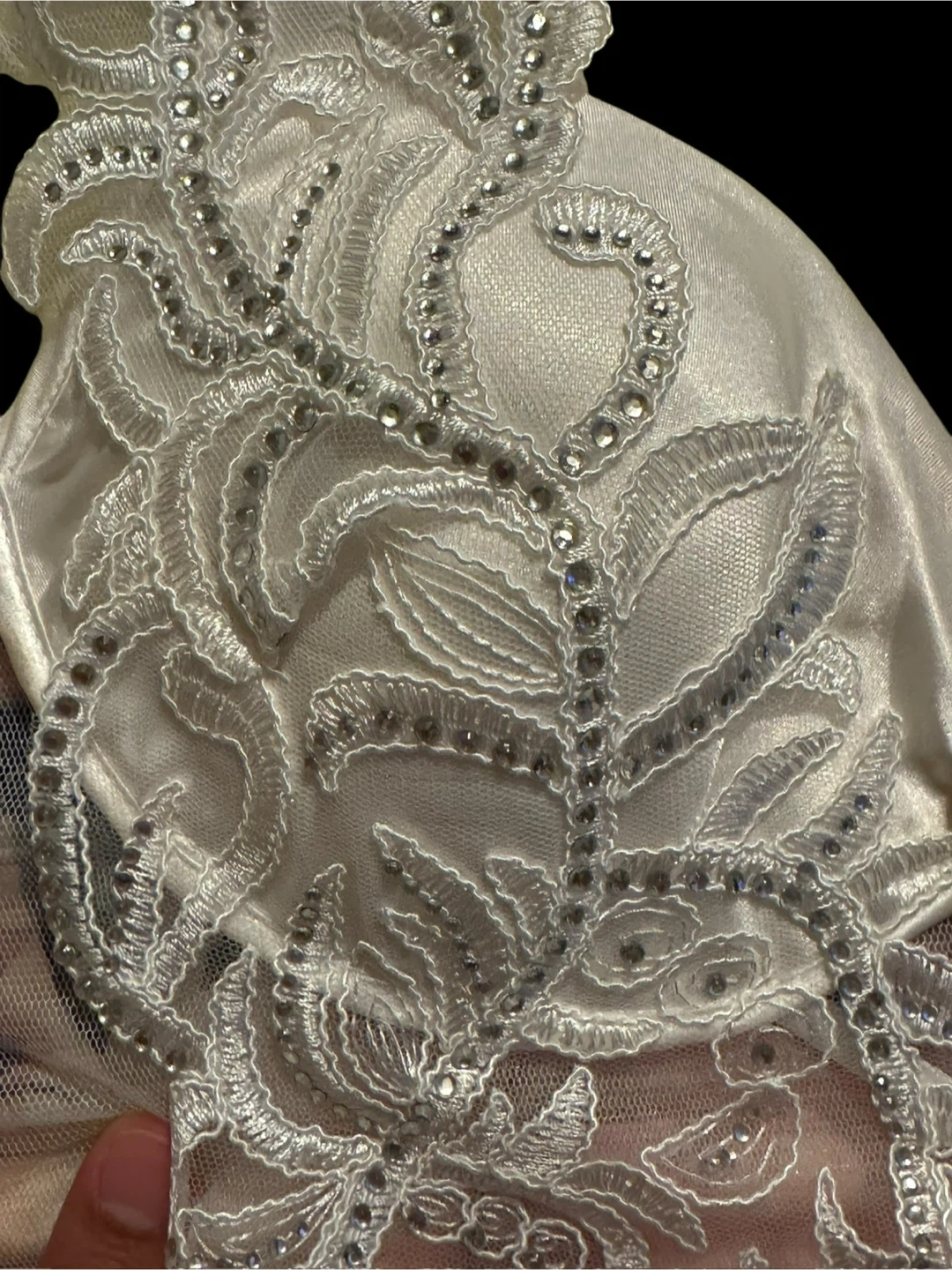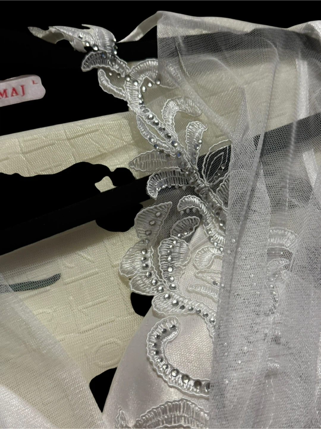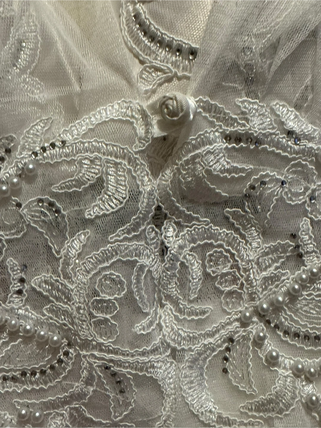 This is a white lingerie dress with delicate embellishments and a sheer overlay. It appears to be in good condition and features intricate detailing on the bodice and sleeves. Perfect for adding a touch of elegance to your wardrobe!