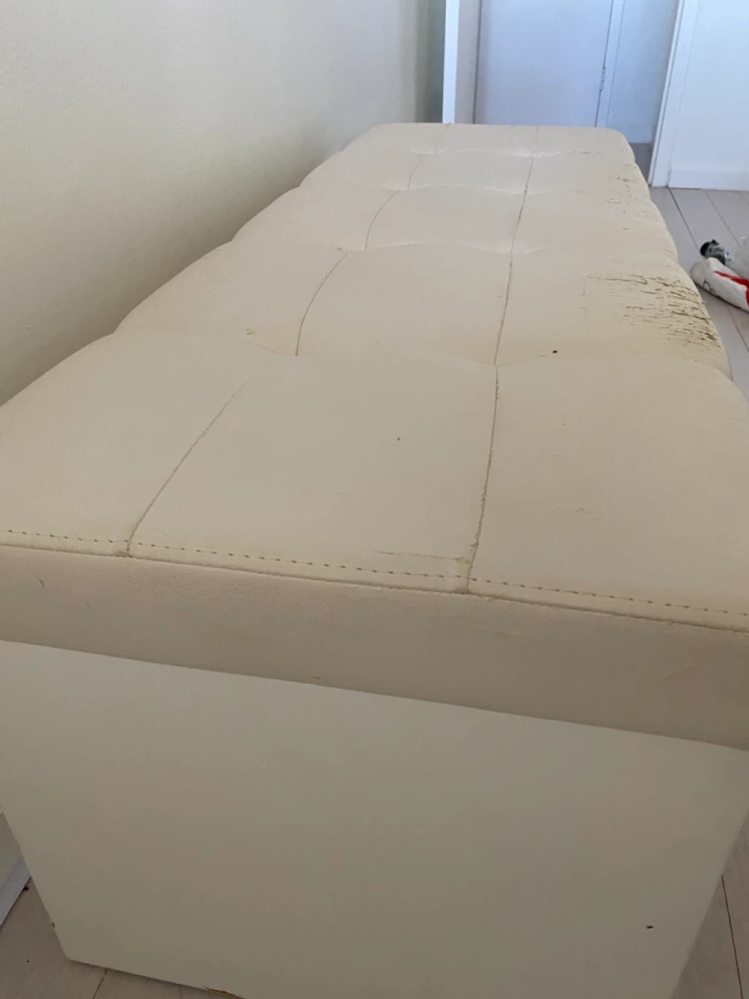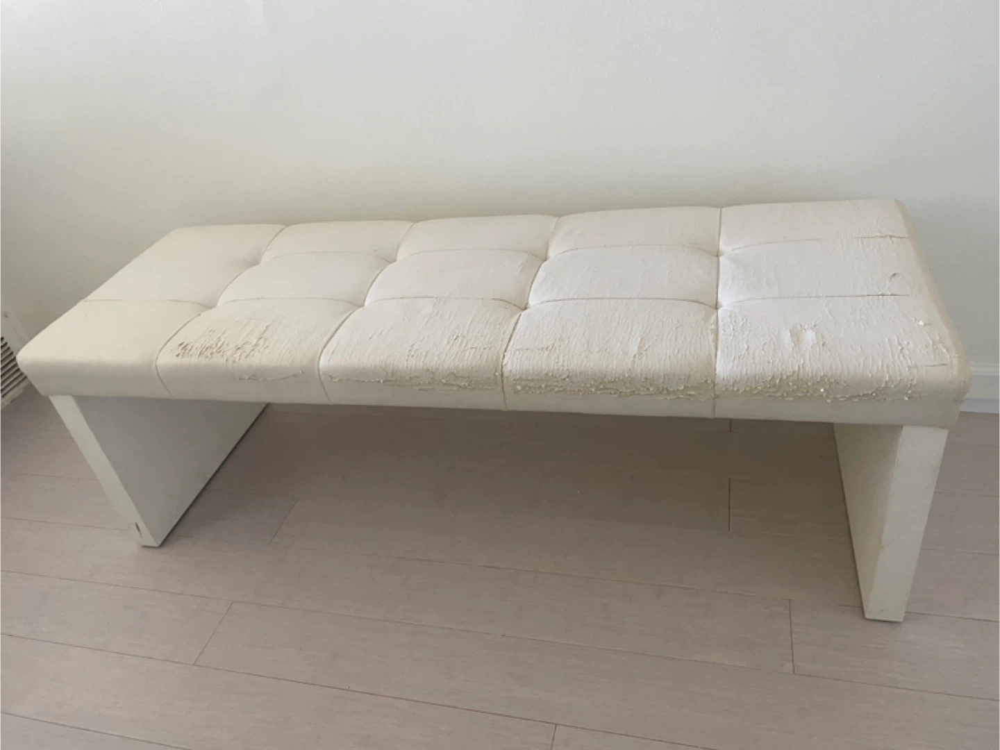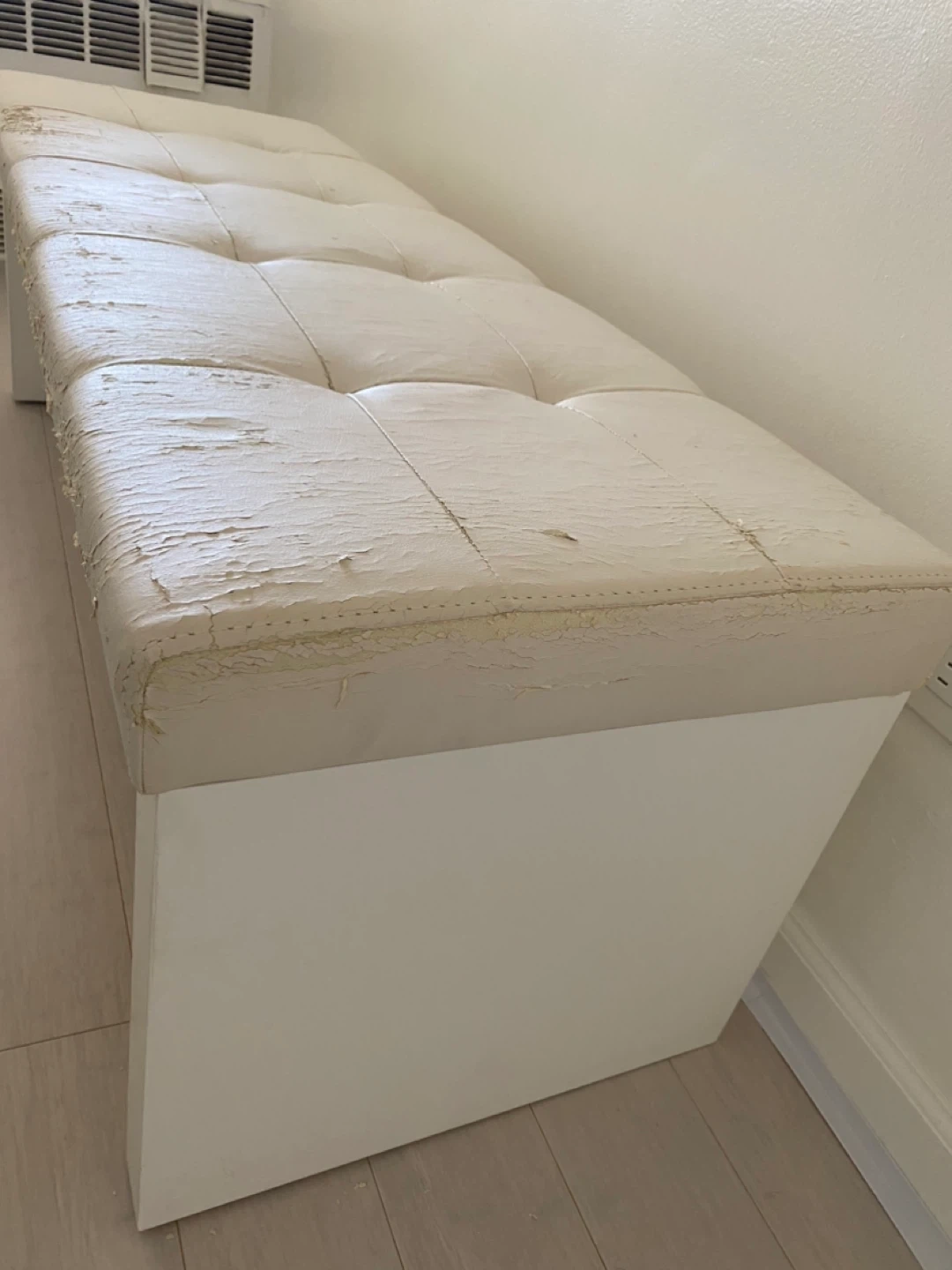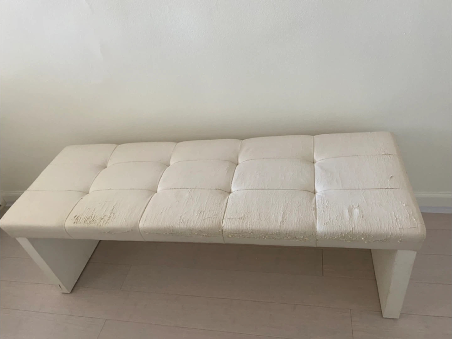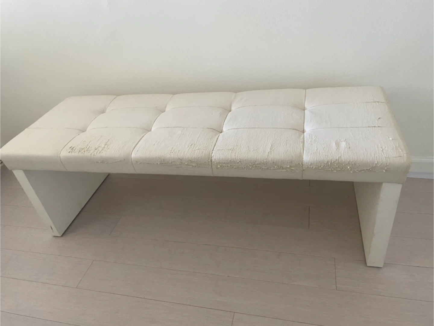 Selling a white faux leather bench. As you can see in the pictures, the faux leather is peeling off the top. It would be great for someone who wants to reupholster it or use it as a project piece