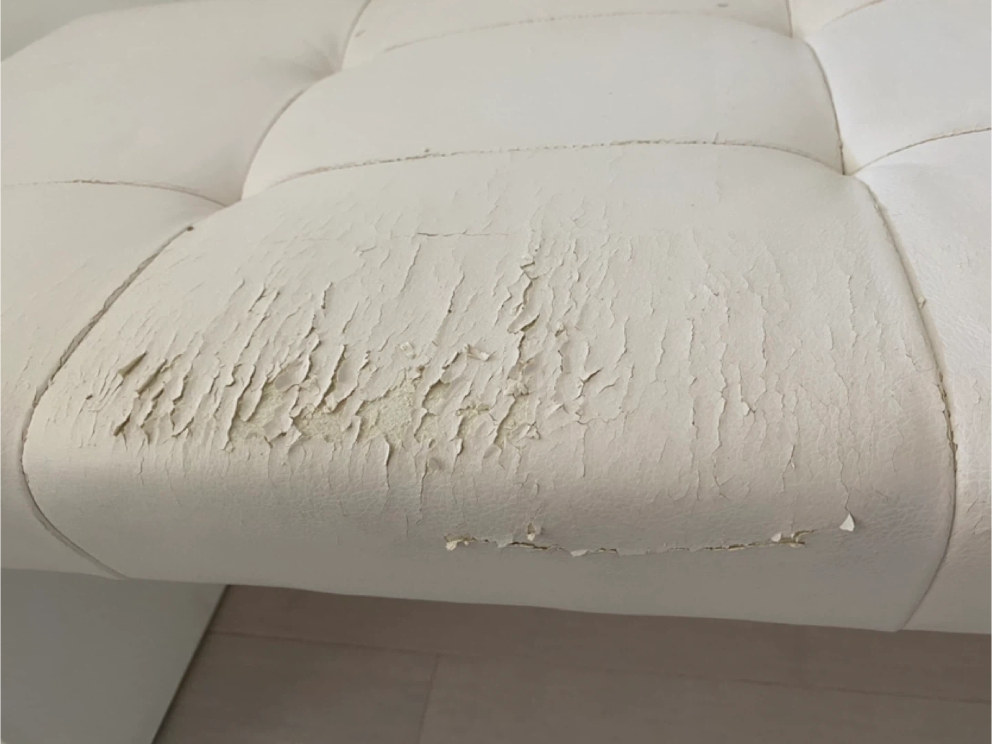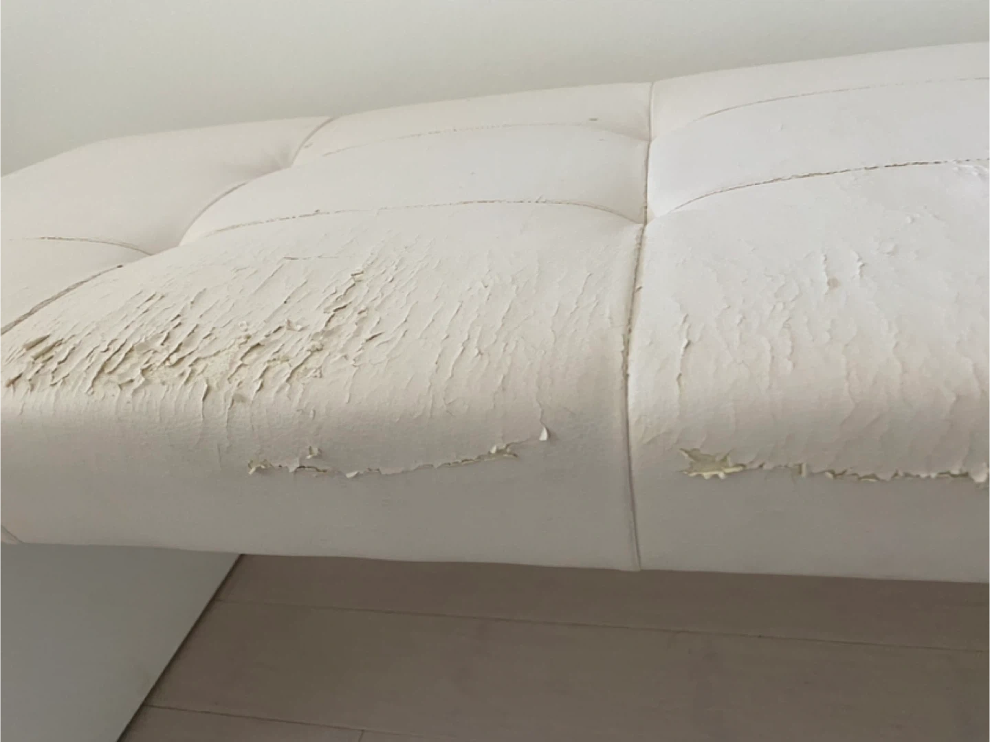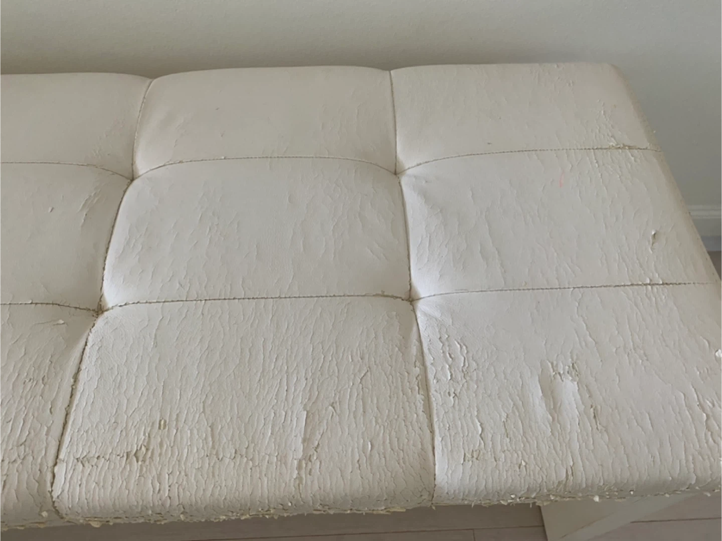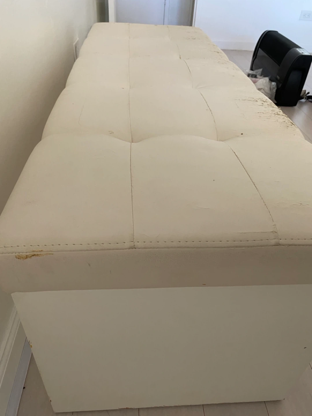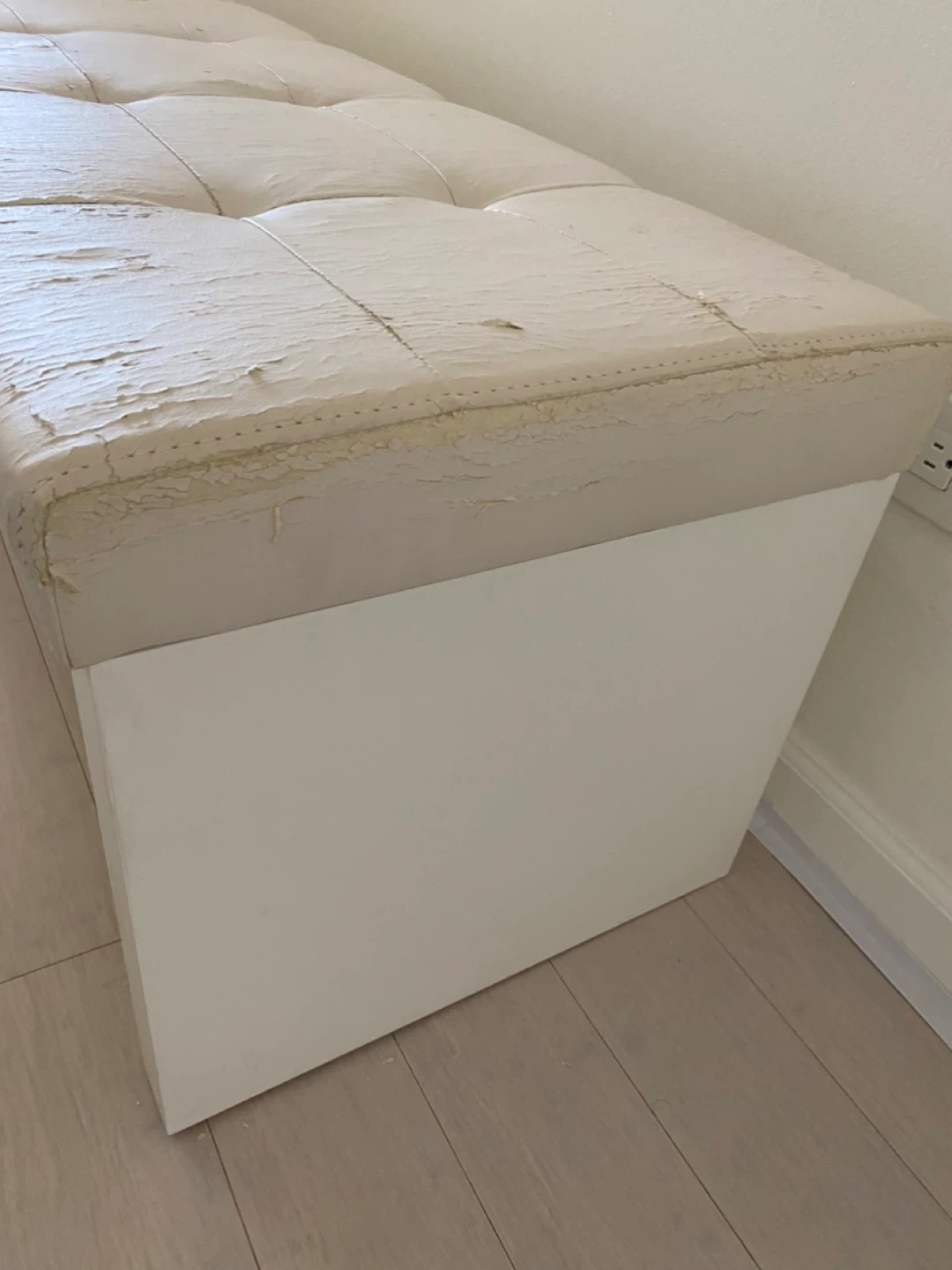 Selling a white faux leather bench. As you can see in the pictures, the faux leather is peeling off the top. It would be great for someone who wants to reupholster it or use it as a project piece