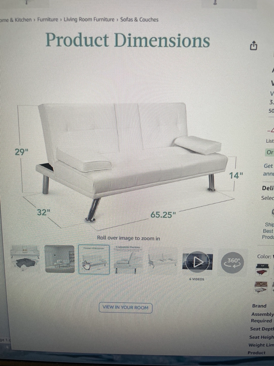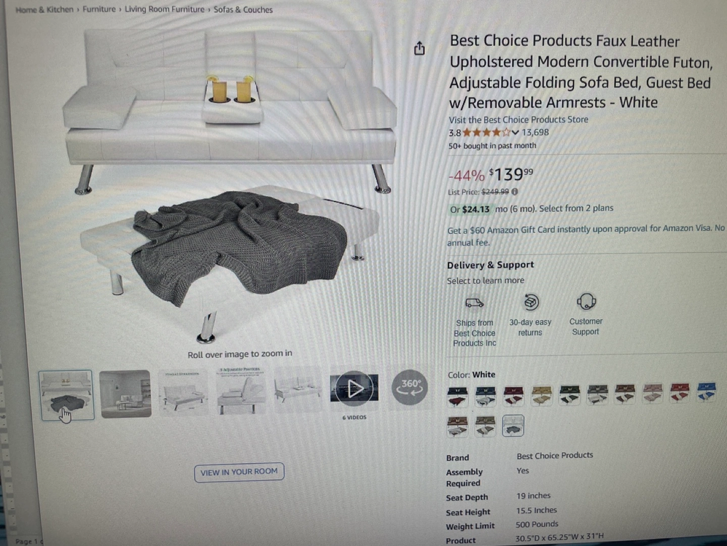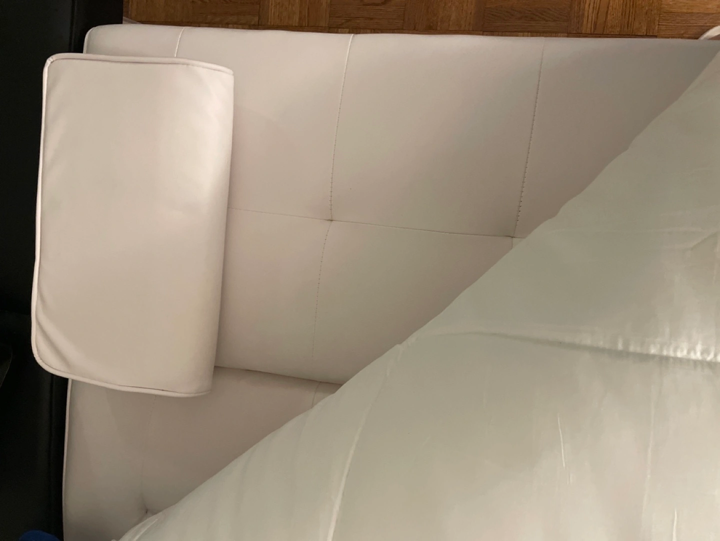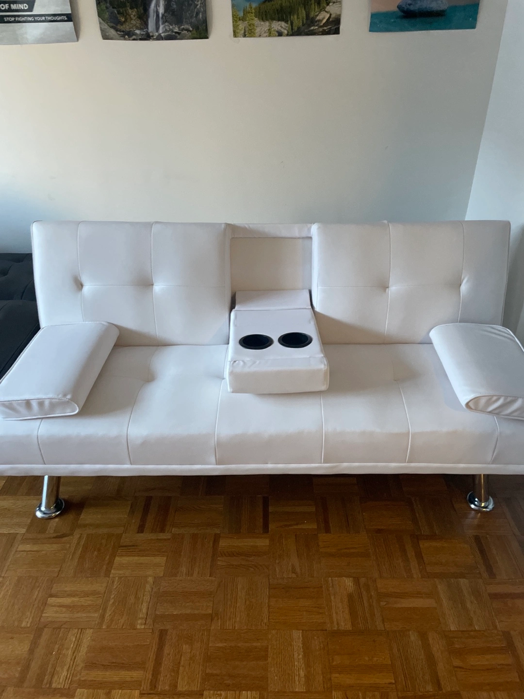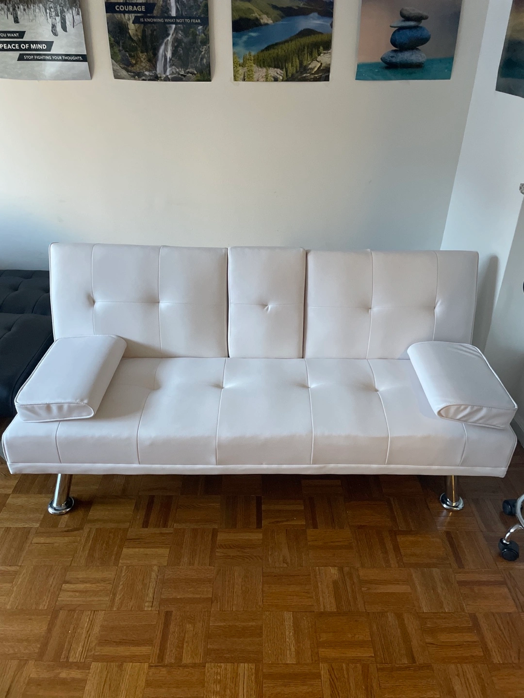 Upholstered modern convertible futon with adjustable folding sofa bed, guest bed, and removable armrests. White color. Bought it for 174.00 sell it 80 Just New. No scratch or anything. Even no dust