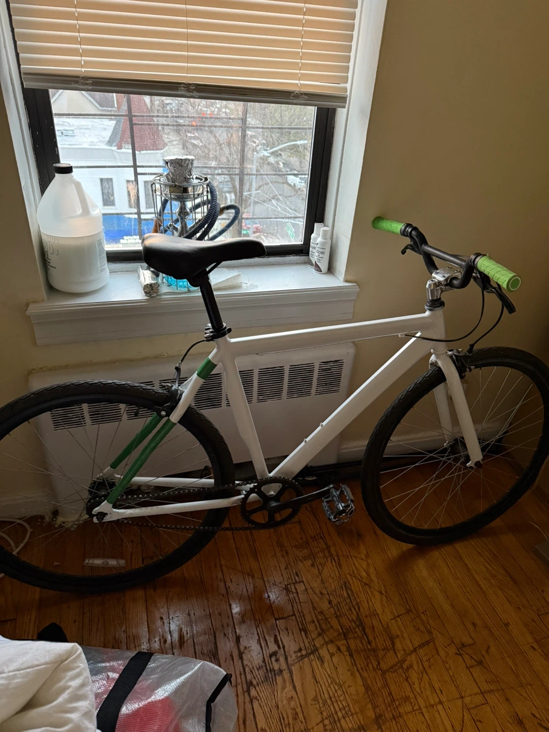 10Selling a fixie bike with a white frame and cool green accents on the handlebars and rear triangle. It's in good condition and ready to ride! Perfect for getting around town