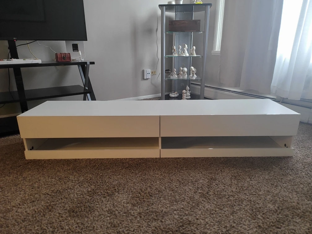 Selling a sleek white floating TV stand! It's in great condition and ready to elevate your living room setup.