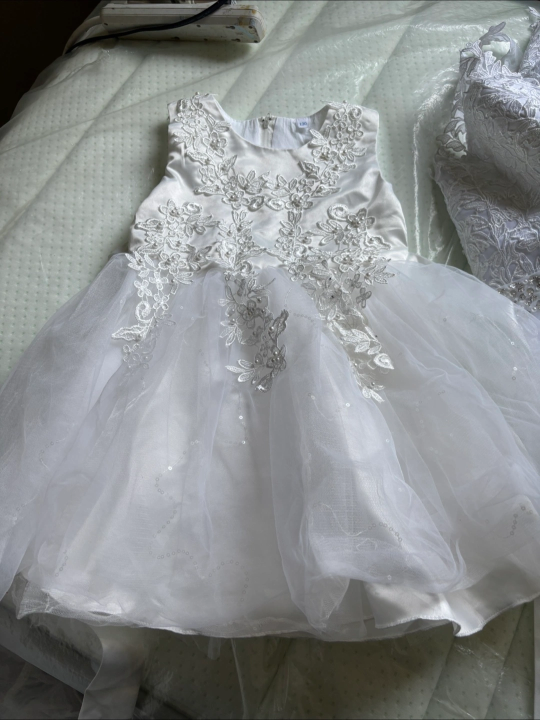 Selling a beautiful white flower girl dress! It features delicate floral embellishments on the bodice and a layered tulle skirt. The size is 120, perfect for a young child. It's in great condition and ready for its next special occasion