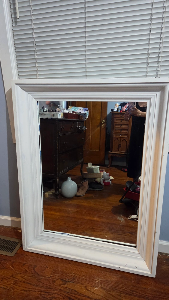 34I'm selling a large wall mirror with a white painted frame. It would look great in any room of the house! it's a very heavy frame and mirror. a little over 3.5 feet.