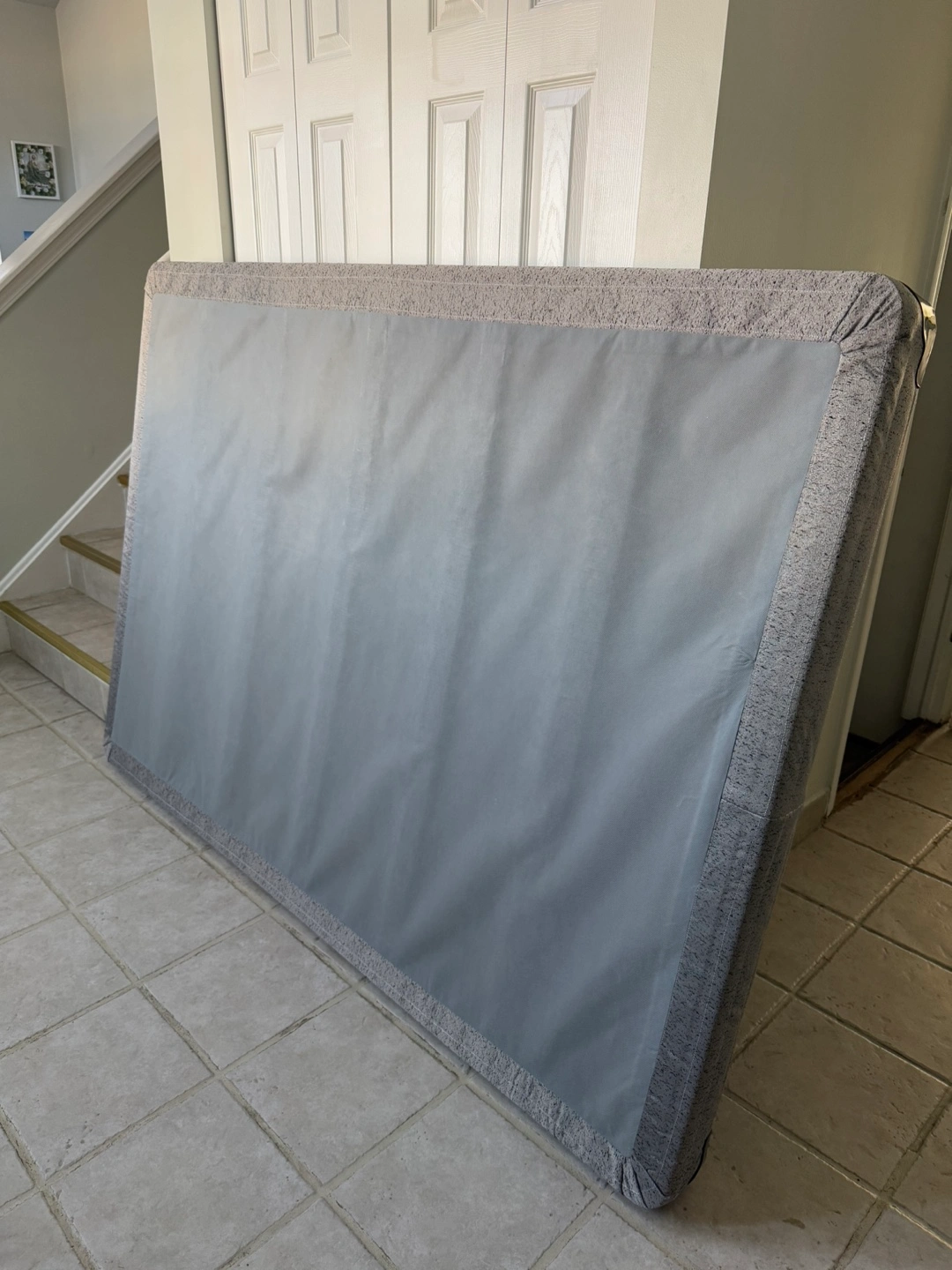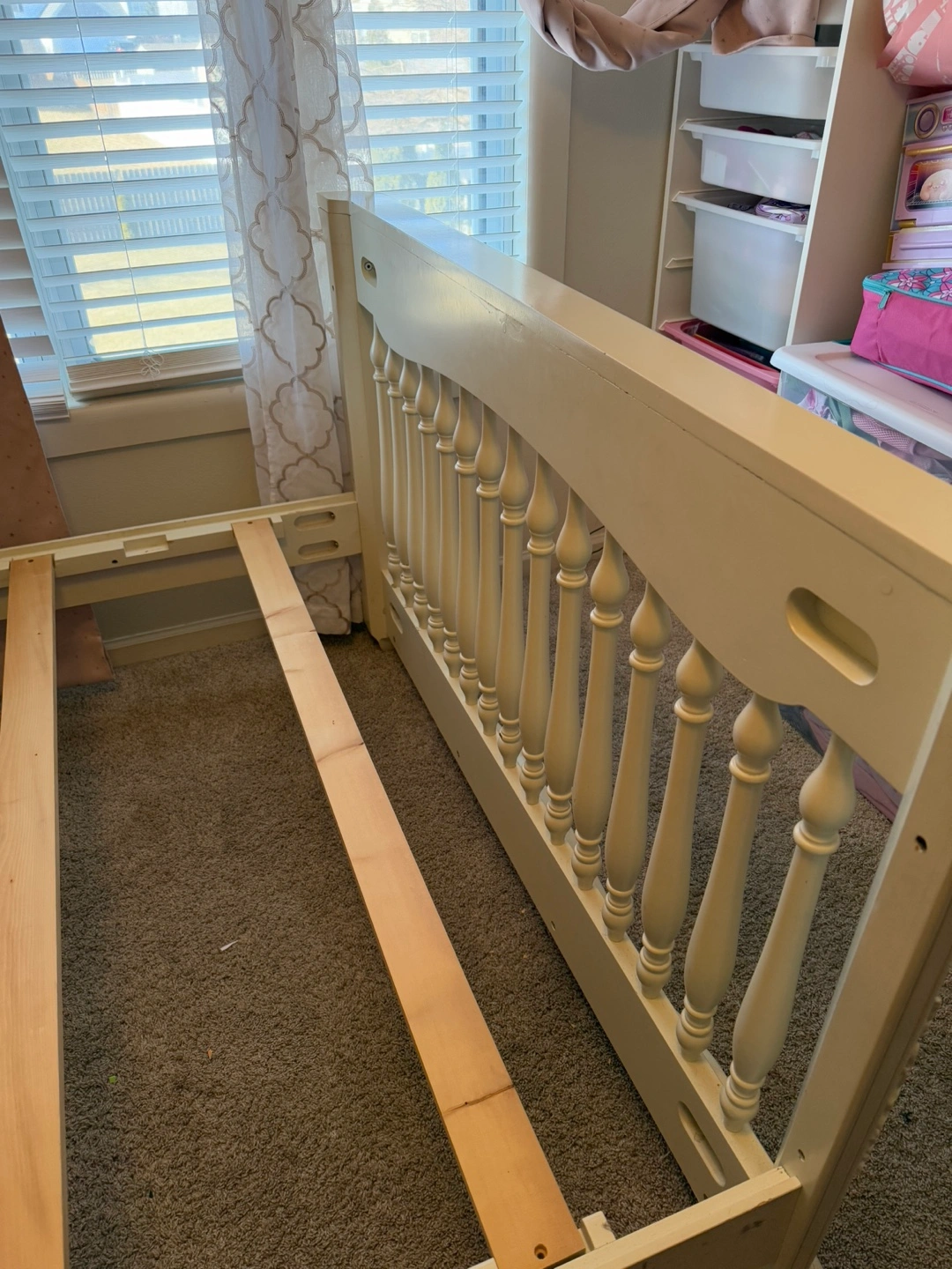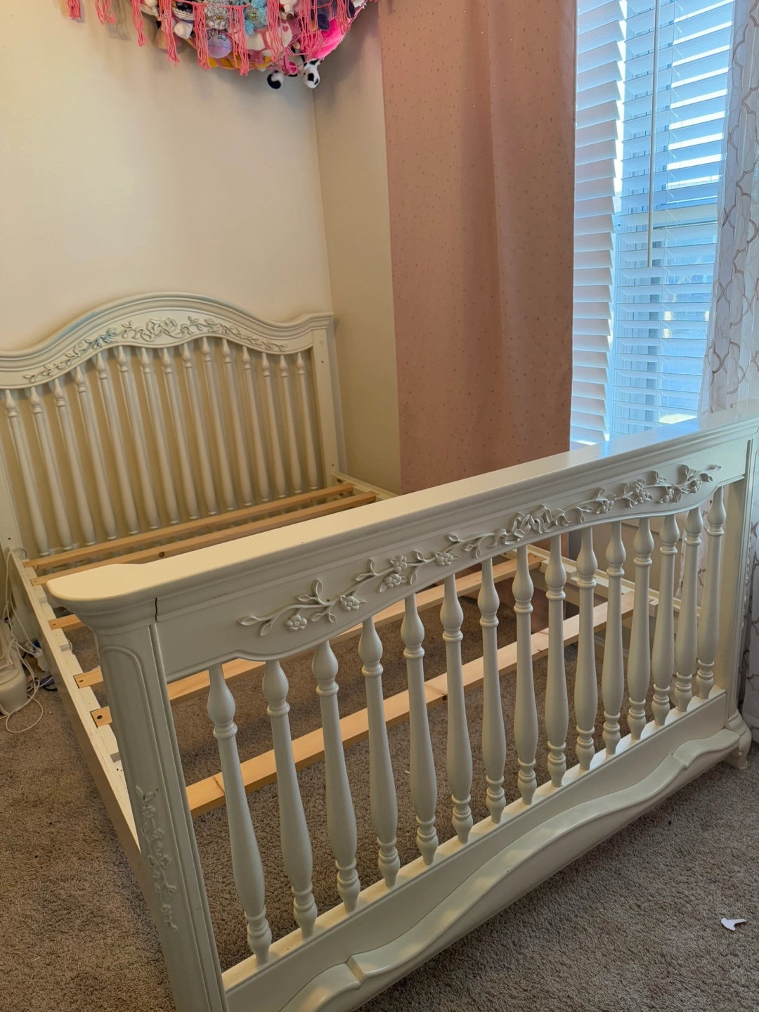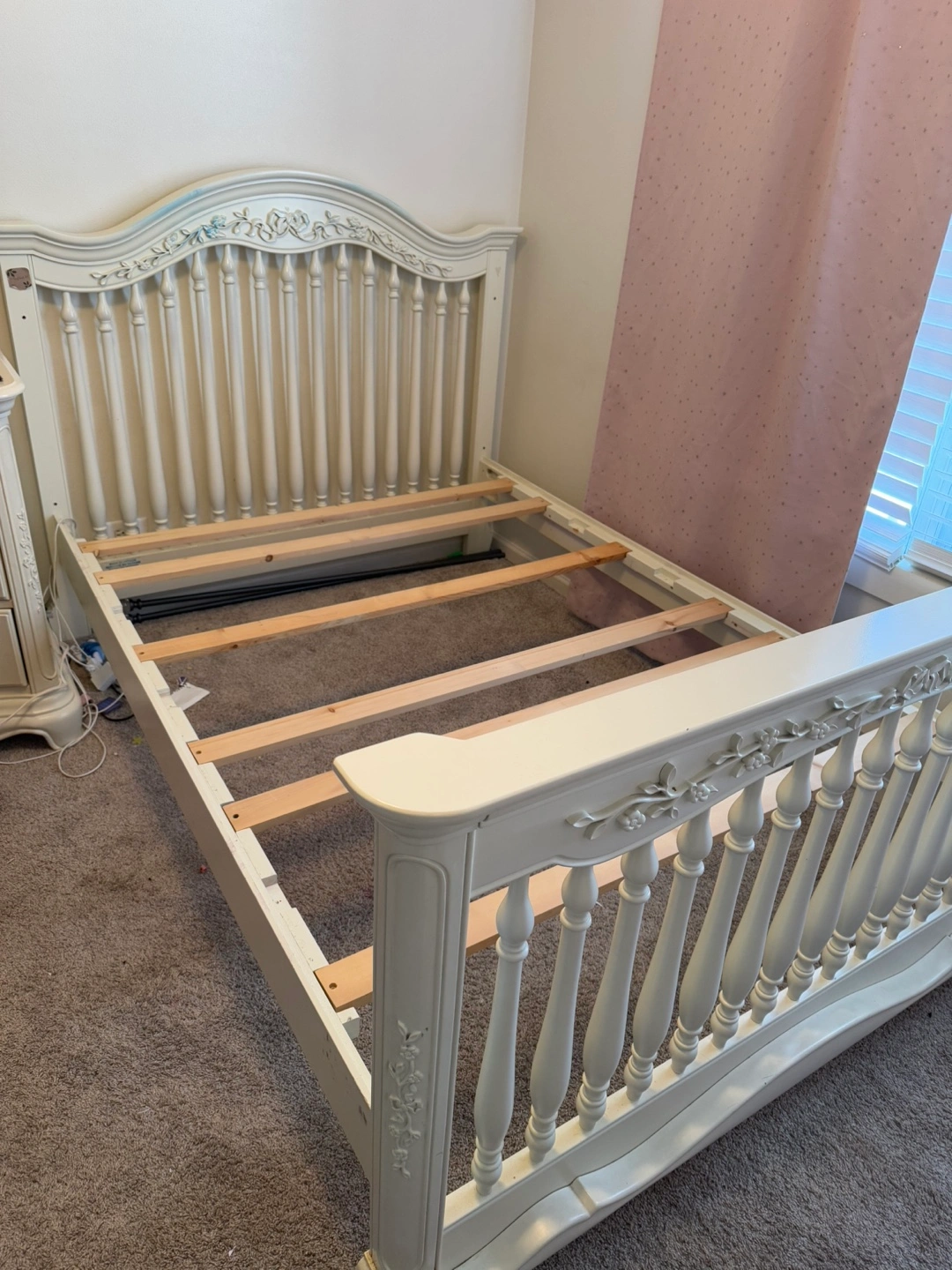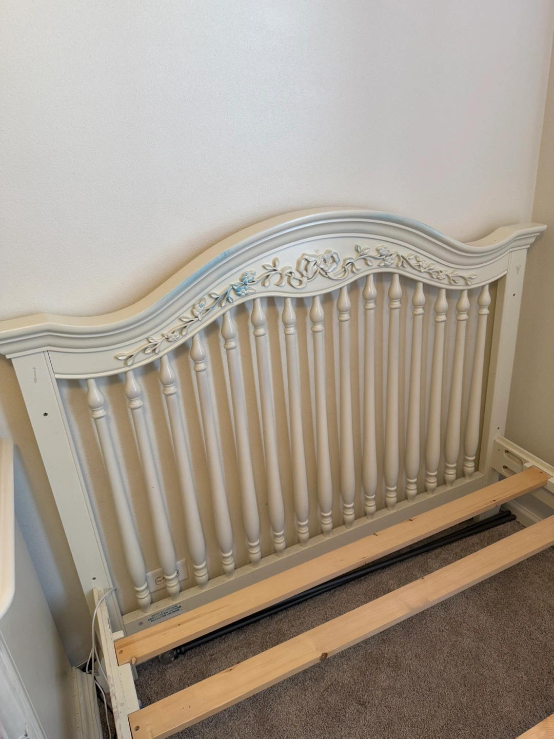 23Elegant full-size bed frame. Off-white finish. Intricate carvings on headboard and footboard. Includes wooden slats for mattress support. includes box spring. It has a blue stain Open to offers!!