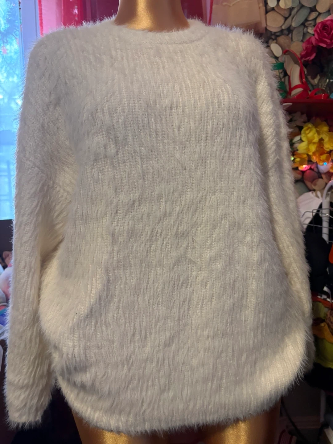 131This is a cozy white fuzzy sweater! It's super soft and perfect for chilly days. It appears to be in good condition and ready for a new home