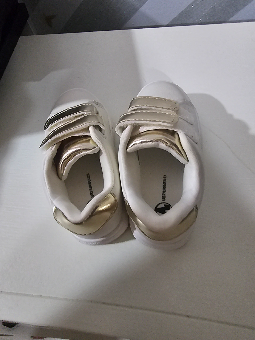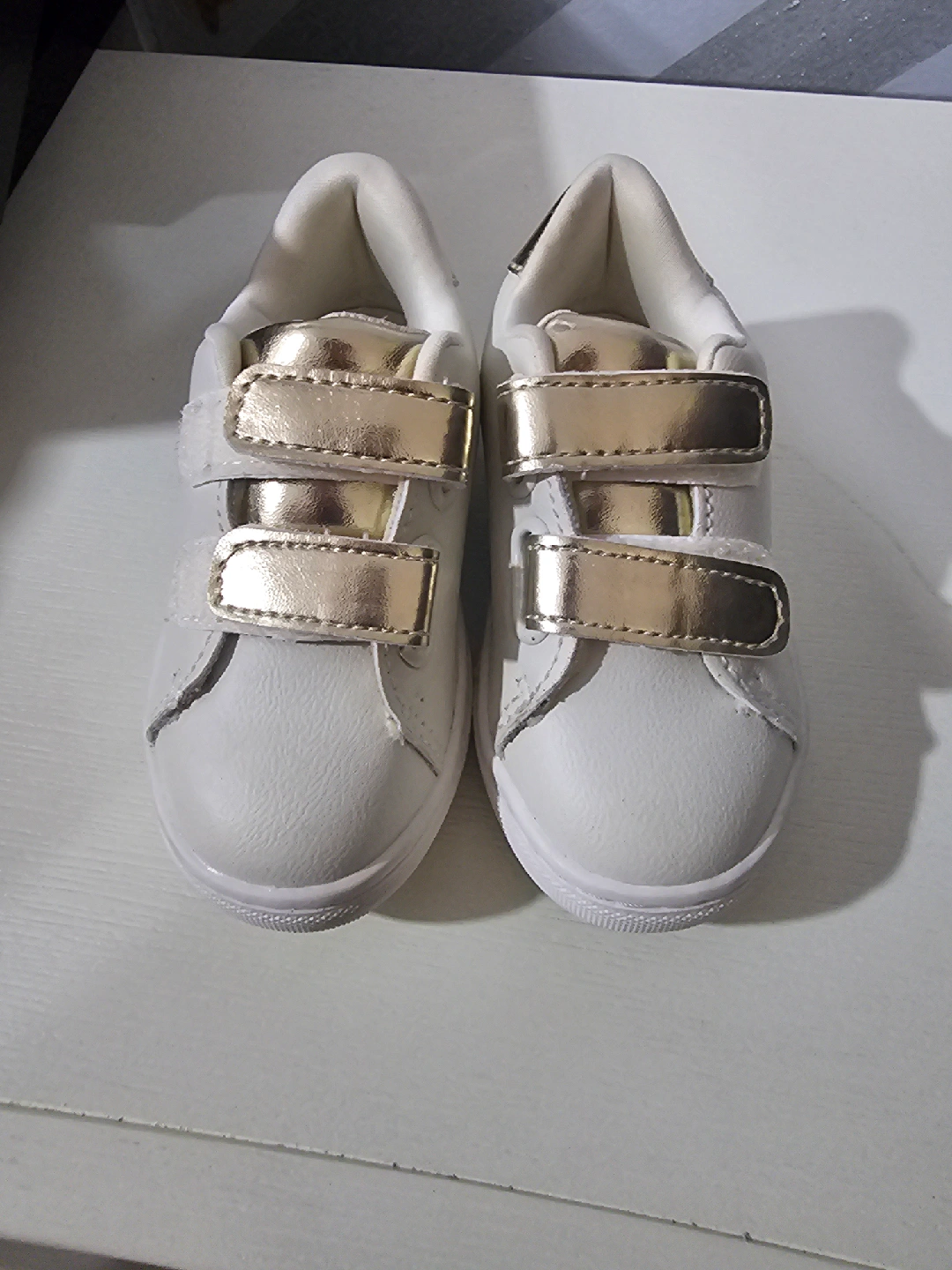 These adorable toddler sneakers feature a classic white base with stylish gold accents! They have convenient velcro straps, making them easy to put on and take off. Perfect for your little one's everyday adventures