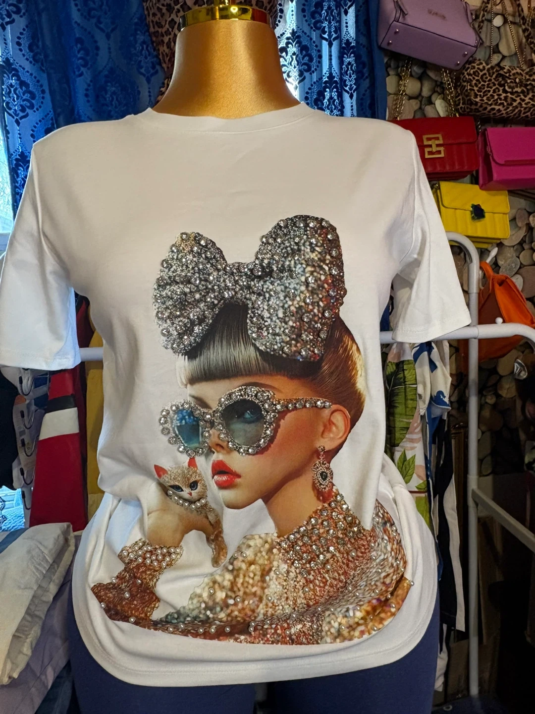 125Cute white T-shirt with a unique graphic design! The design features a woman with a rhinestone bow and sunglasses, plus a little kitty. It's a fun and stylish piece to add to your wardrobe