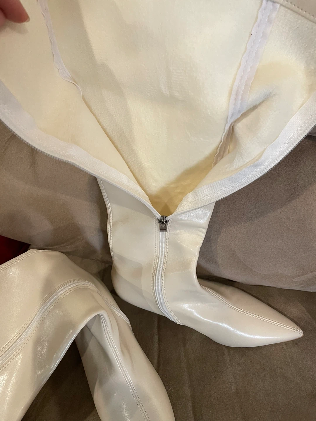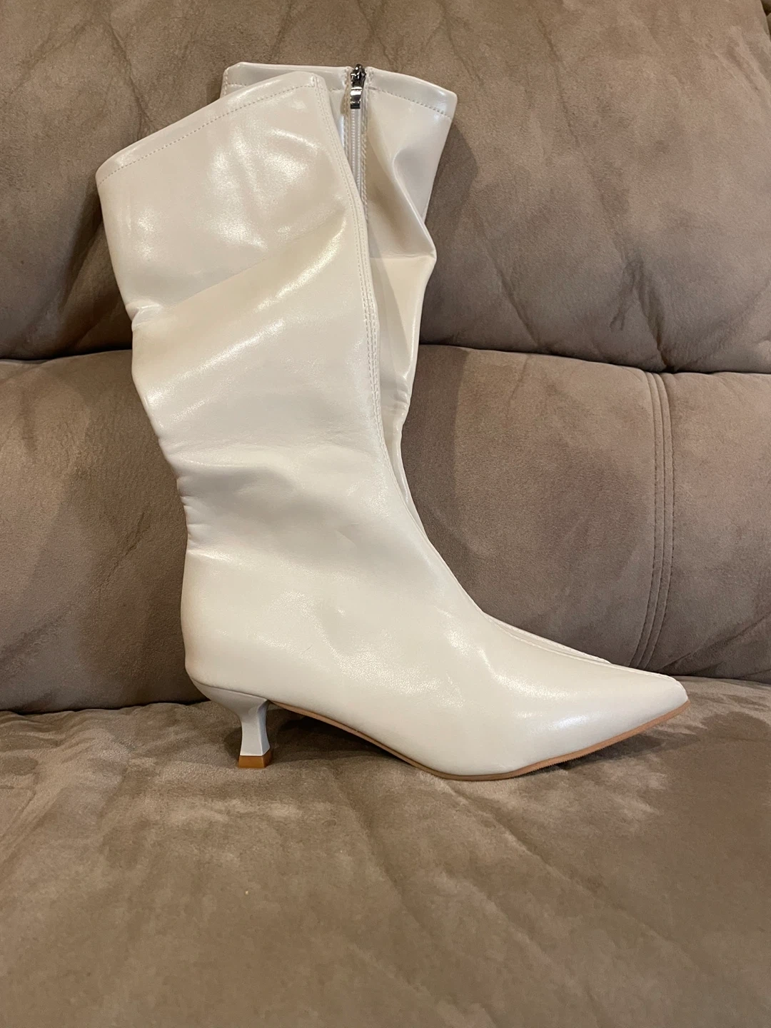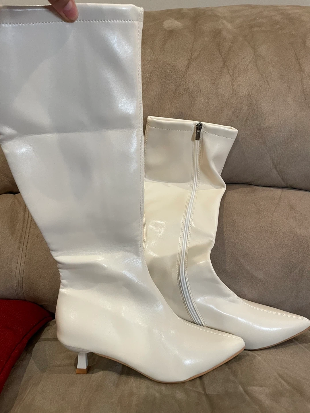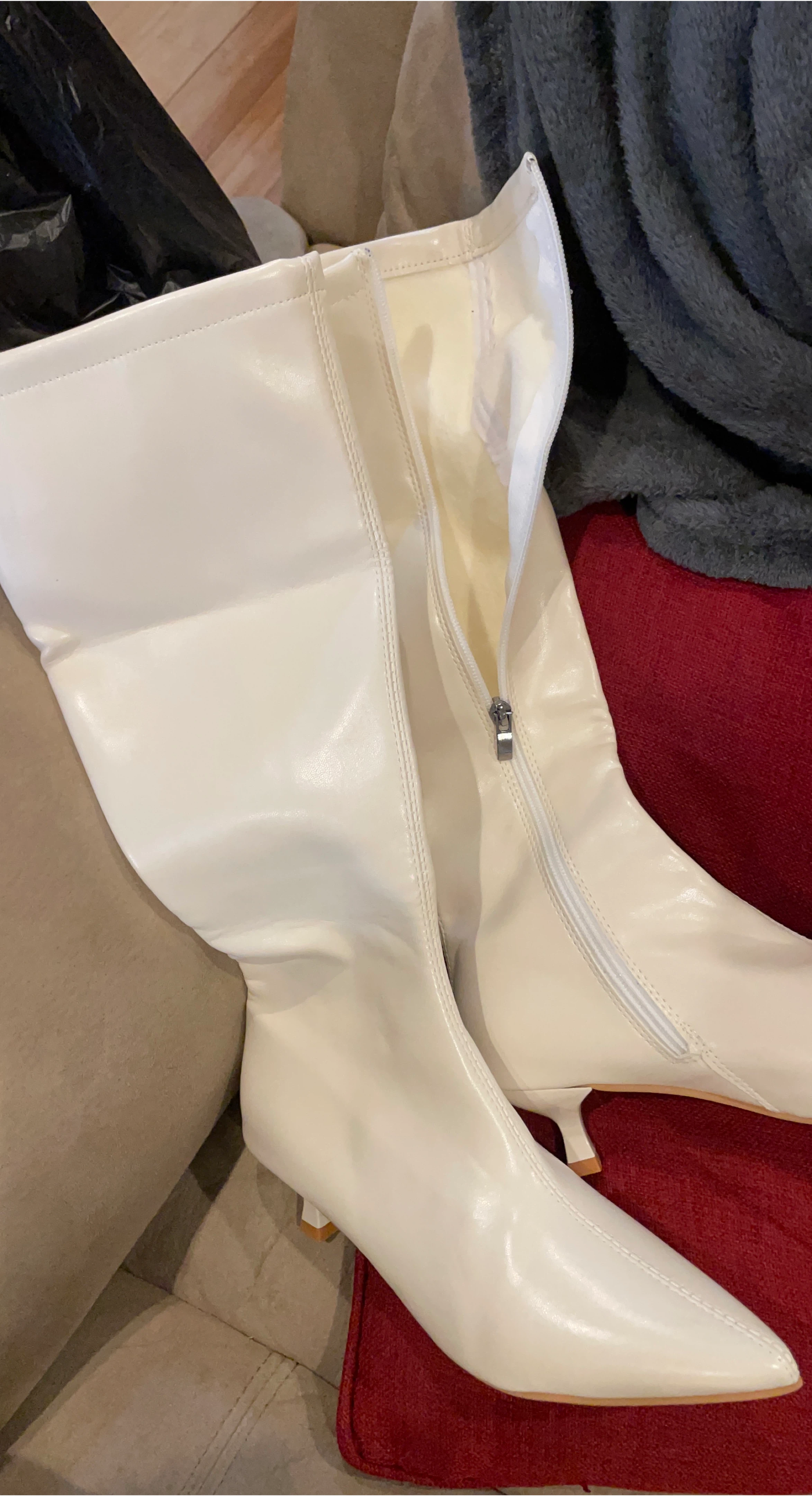 5These white knee-high boots are super cute and ready for a new home! They feature a sleek design with a comfortable heel height, perfect for adding a touch of style to any outfit. They are in great condition!
