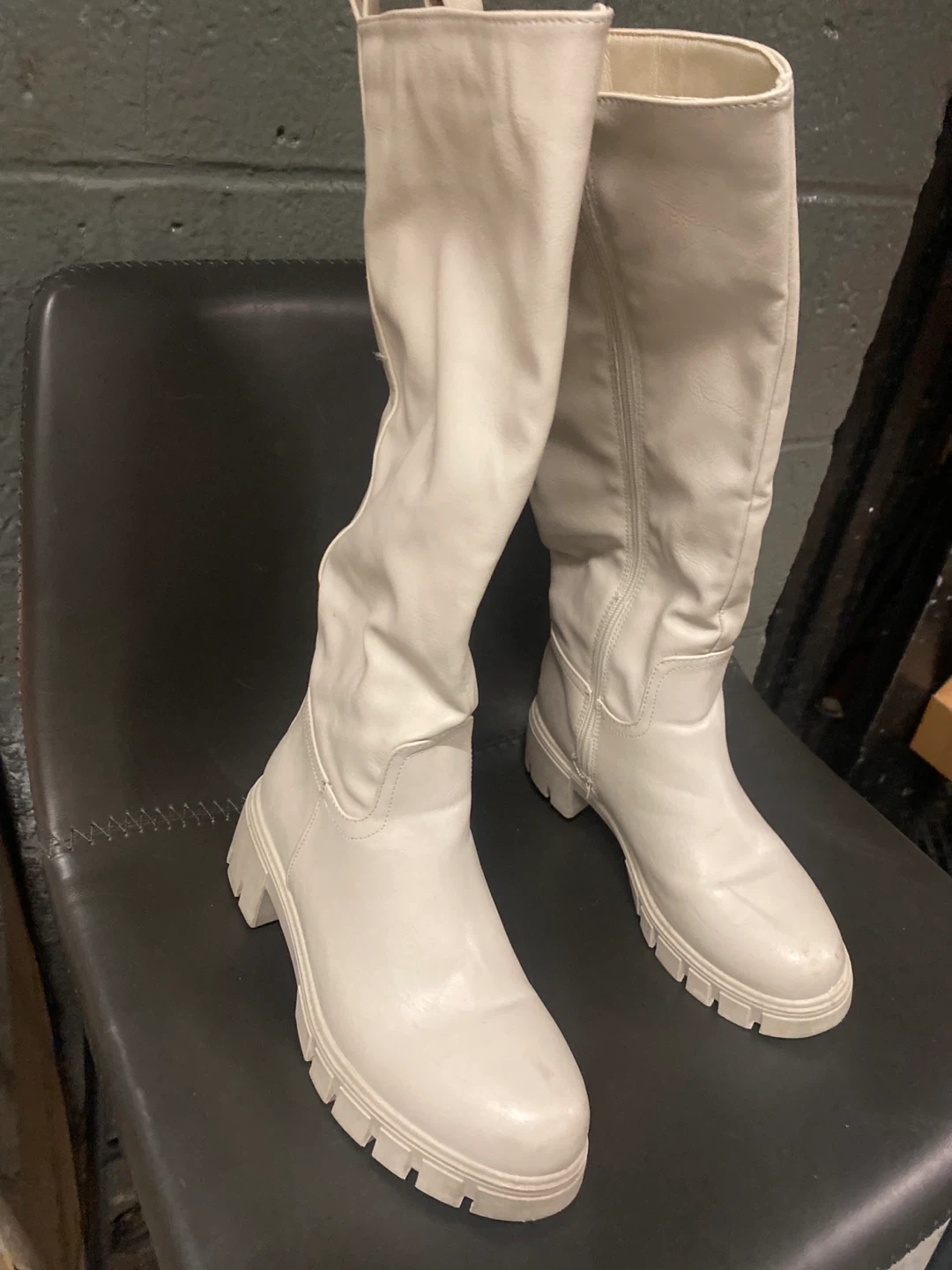 Selling a pair of white knee-high boots. They have a platform sole and a zipper on the side. Perfect for fall!