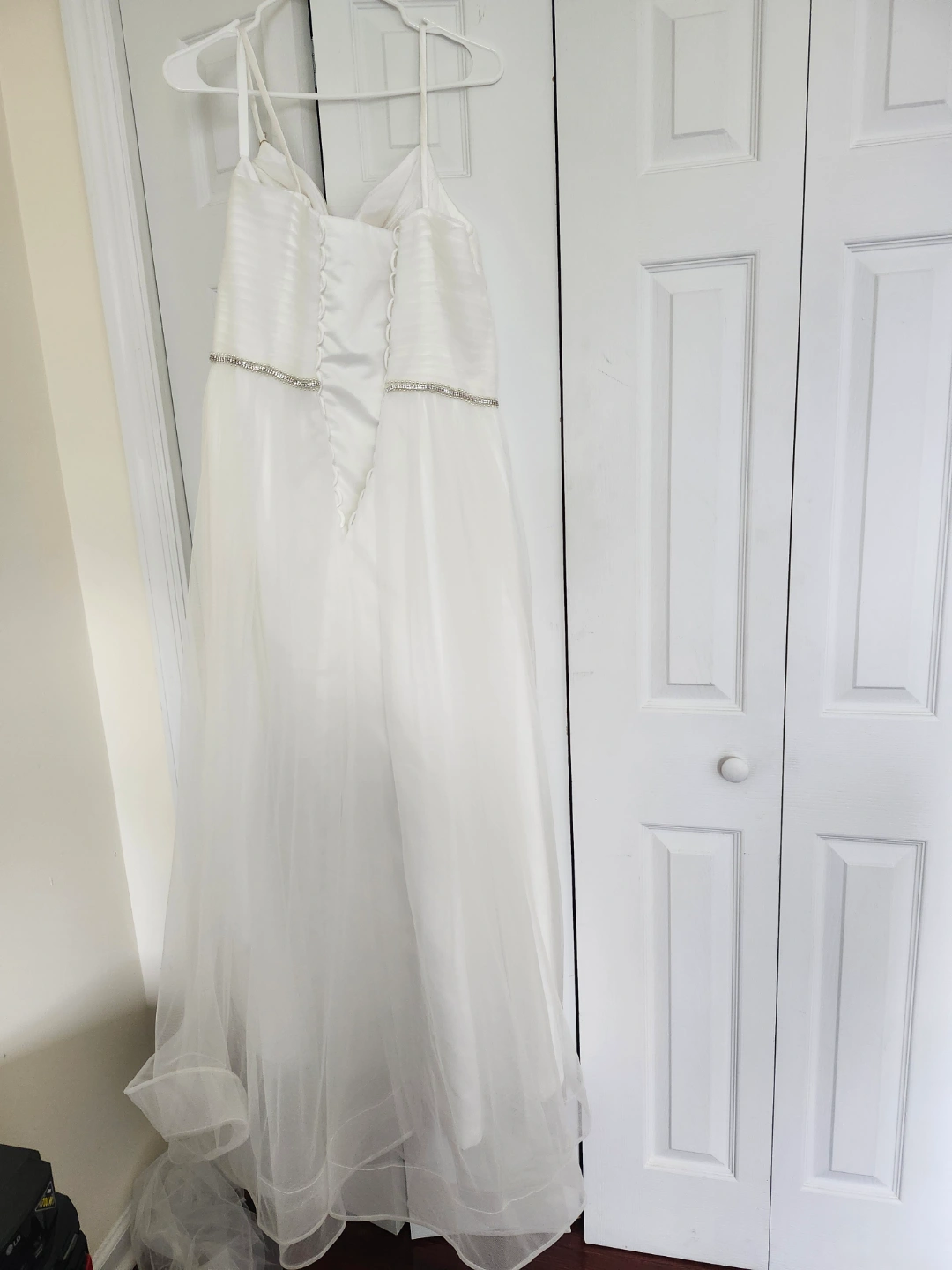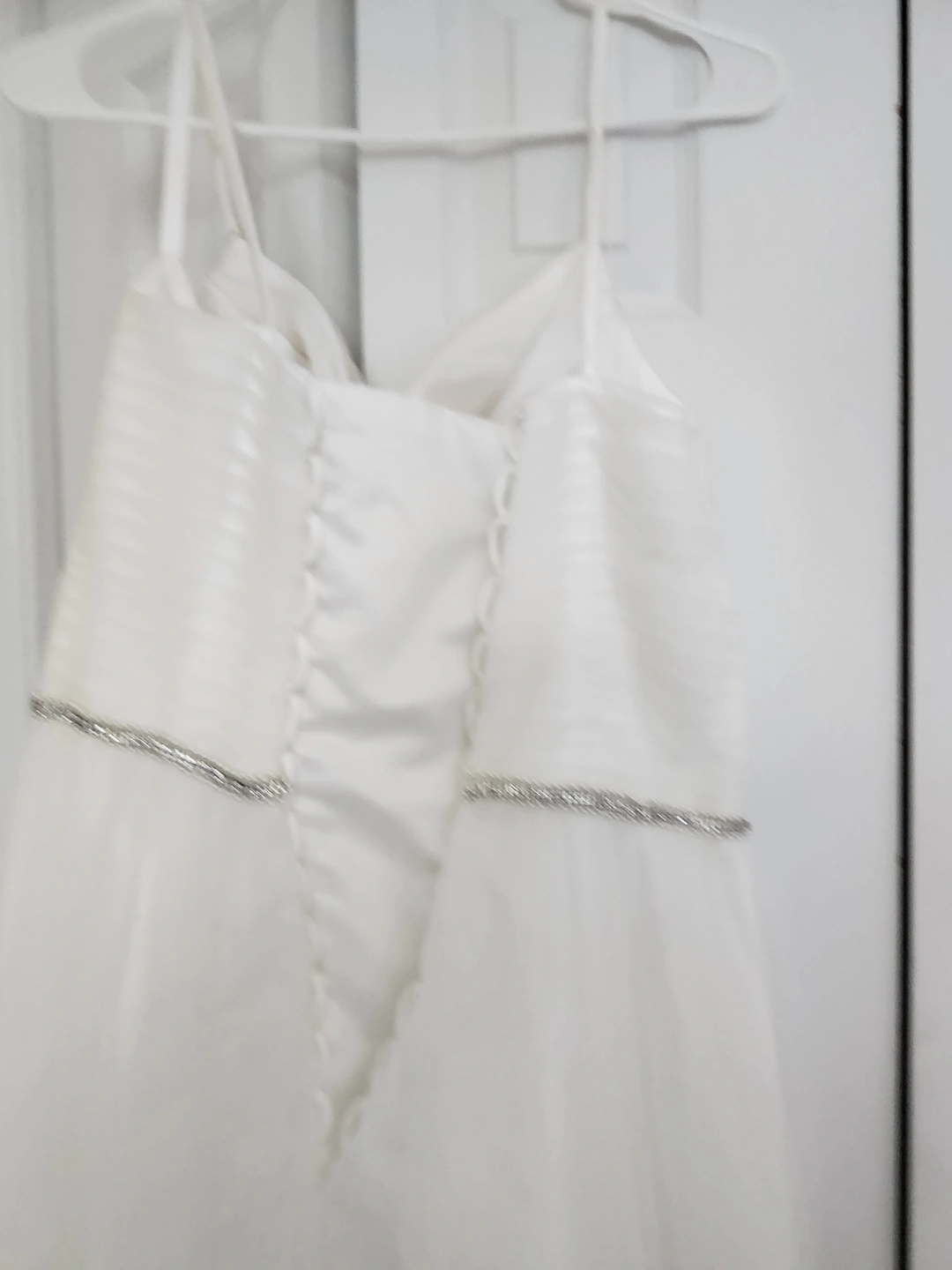 Beautiful white wedding dress. Features an A-line silhouette, high-low hemline, and a rhinestone belt. Sweetheart neckline and spaghetti straps. Back zipper closure.