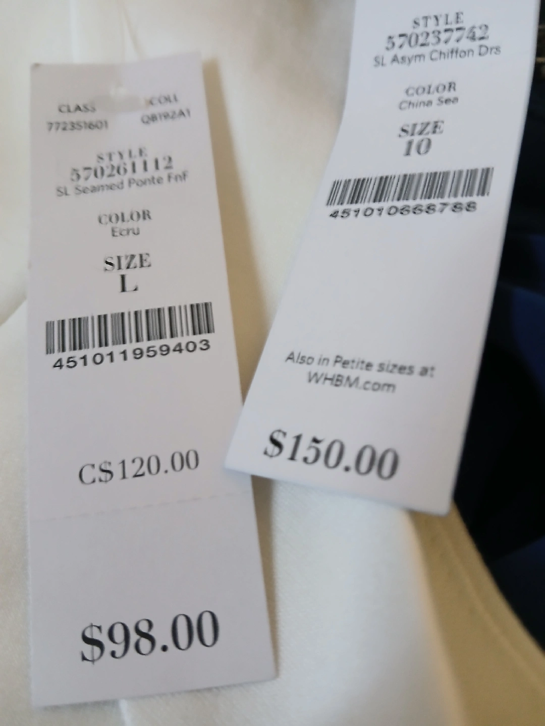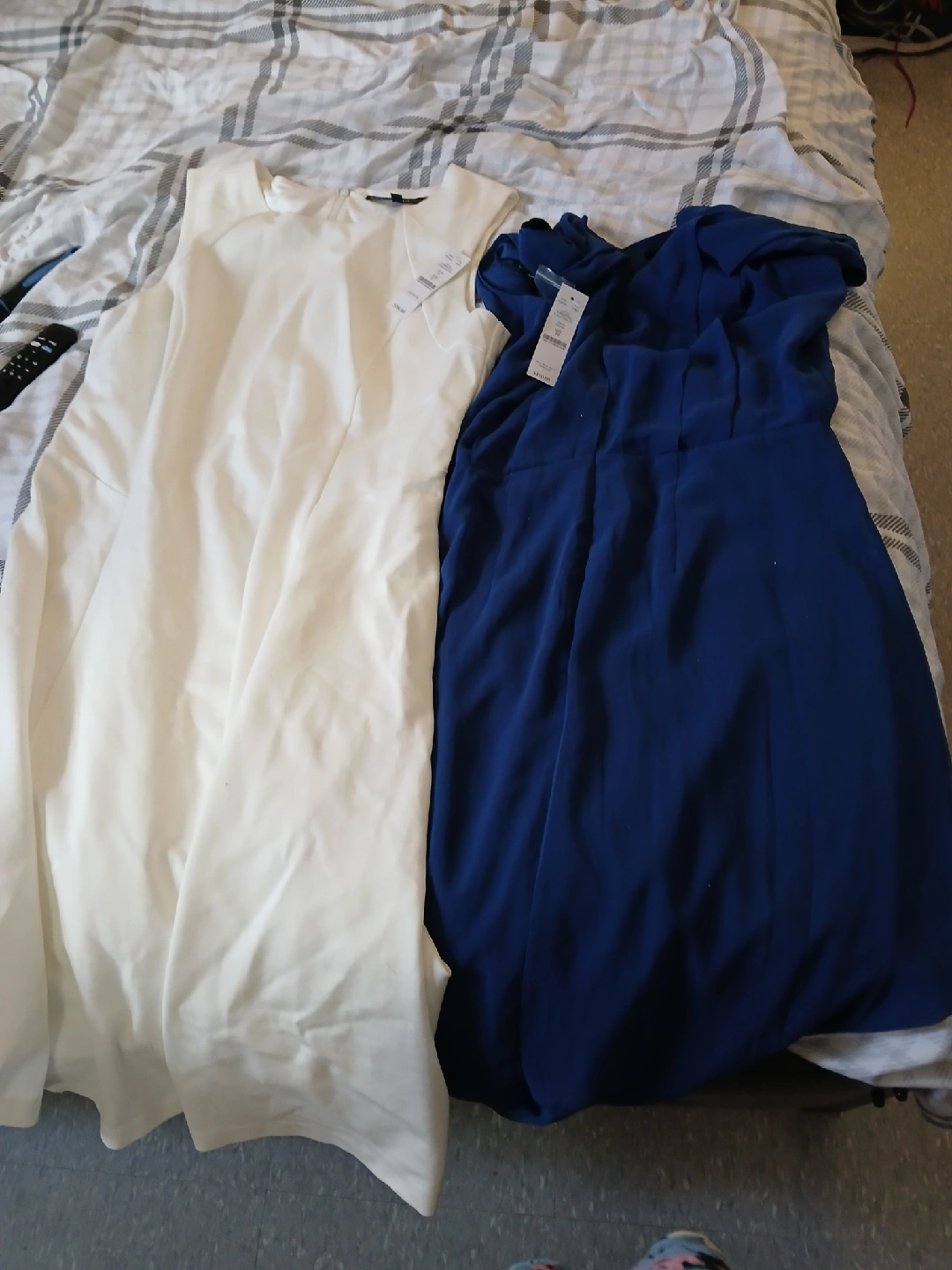 15Two beautiful dresses from White House Black Market! One is a size 10 asymmetrical chiffon dress in a lovely 'China Sea' blue. The other is a size L seamed ponte dress in 'Ecru' (off-white). Both are in excellent condition and ready for a new home! Originally priced at $150 and $120.
