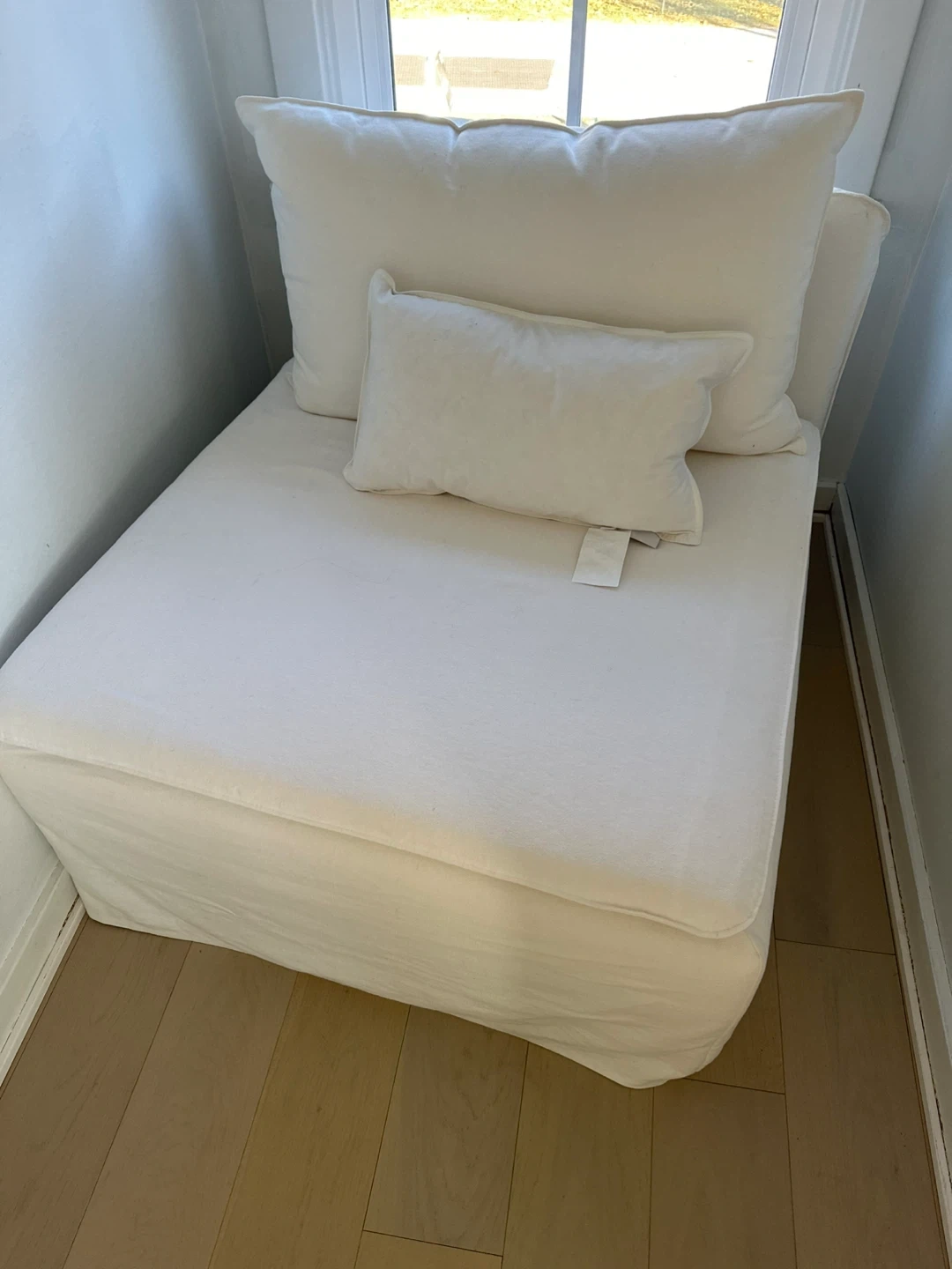 MOVING! Need to sell this week! Cozy oversized white reading nook chair from ikea with custom new’ish slipcover. It comes with the pillows shown in the picture. Perfect for creating a comfy corner to relax and read in your home.