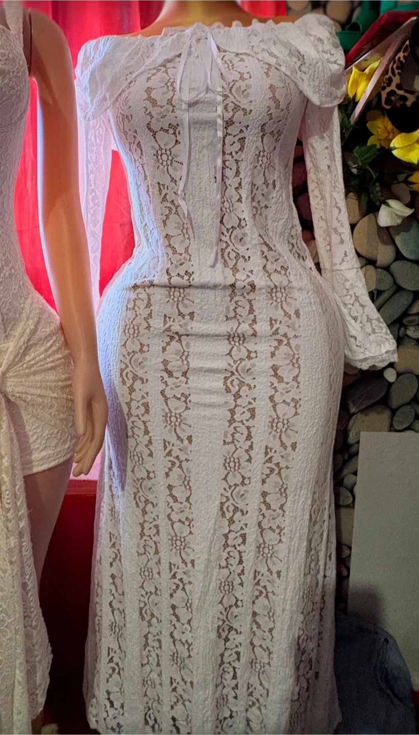 153Beautiful white lace dress, perfect for a special occasion! The dress features a delicate lace pattern and a flattering silhouette. It's in great condition and ready for a new home