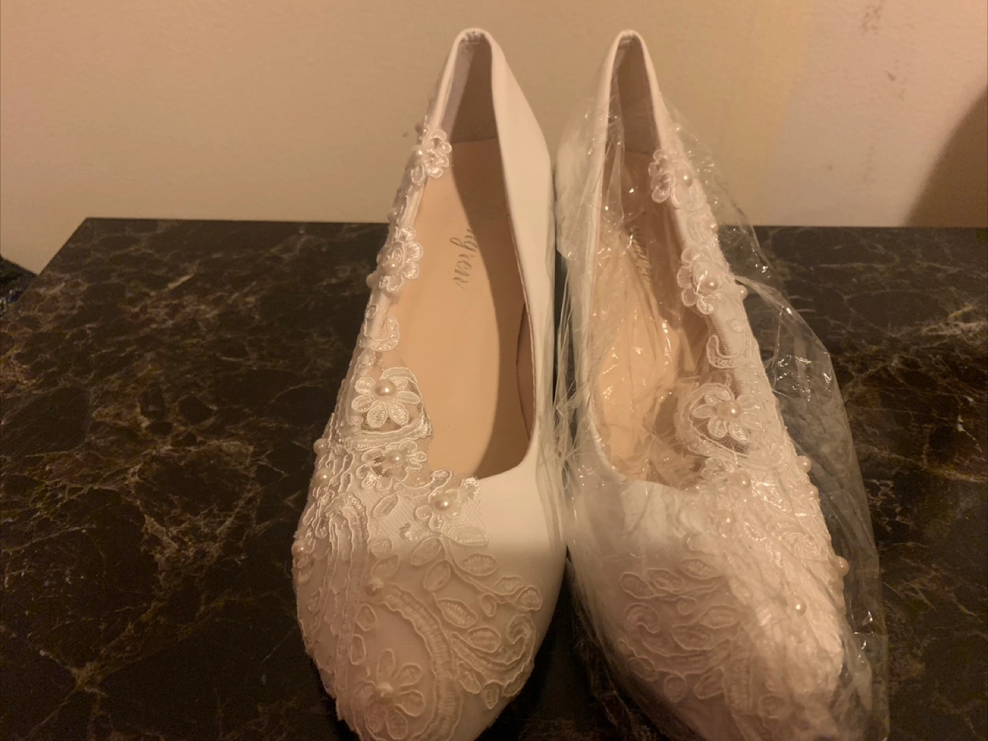 These are a pair of white heels with lace and pearl detailing. They would be perfect for a special occasion!