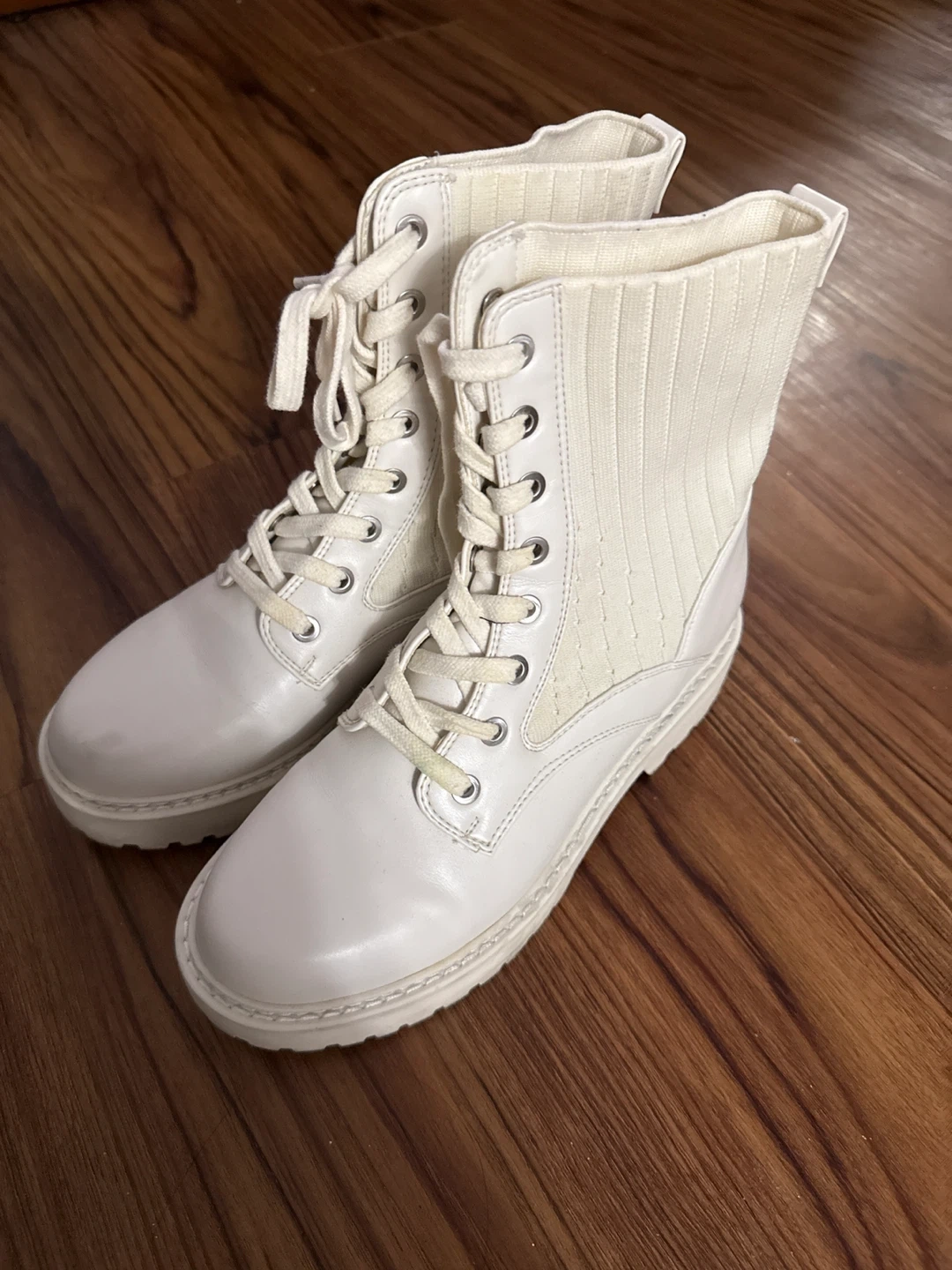 10Selling a pair of white lace-up boots. They are in great condition and ready for a new home! The boots feature a classic lace-up design with a modern touch. Perfect for adding a stylish edge to any outfit