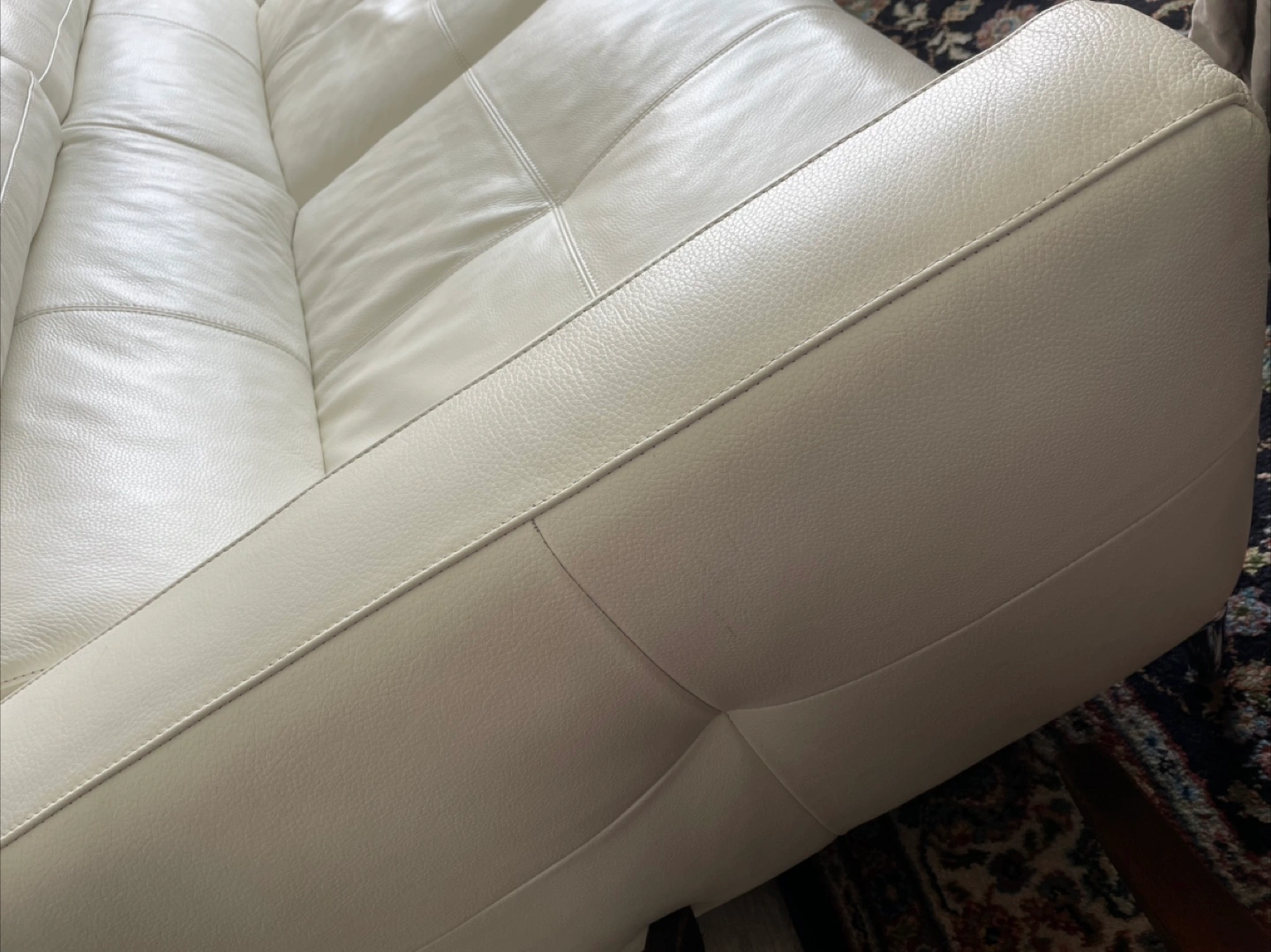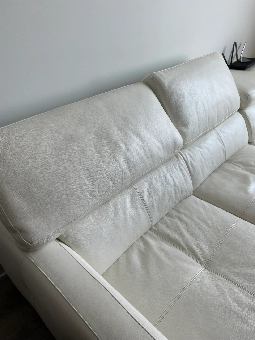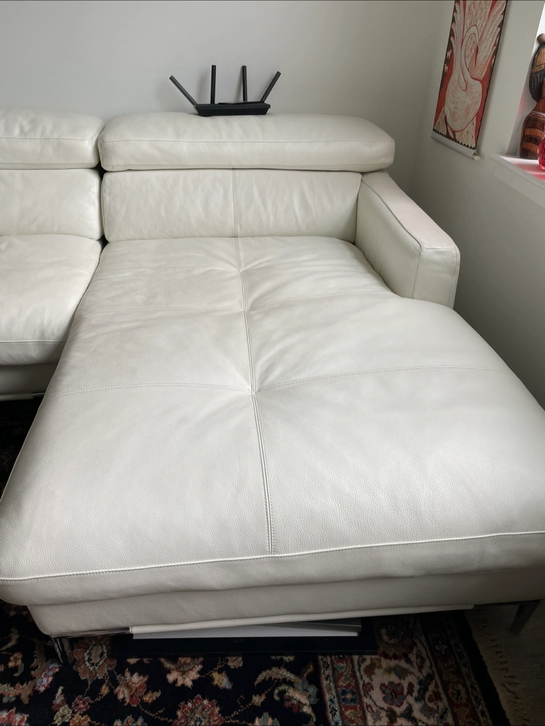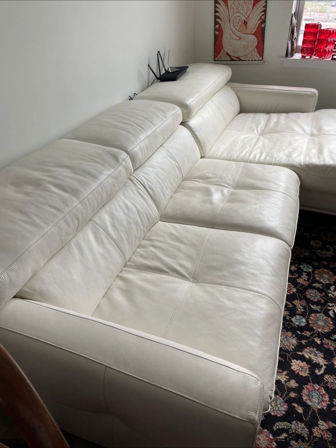 The white Italian leather sectional sofa offers stylish and comfortable space. Its cushions and adjustable headrests add extra comfort. With its contemporary design and neutral color, it can easily blend into any space, perfect for cozy evenings. It’s been sitting for a living space of 1 bedroom apartment. One damage (last picture) is on the headrest, but other than that, it’s in an excellent condition. Originally bought for over $3500. Pickup only from downtown Jersey City.
