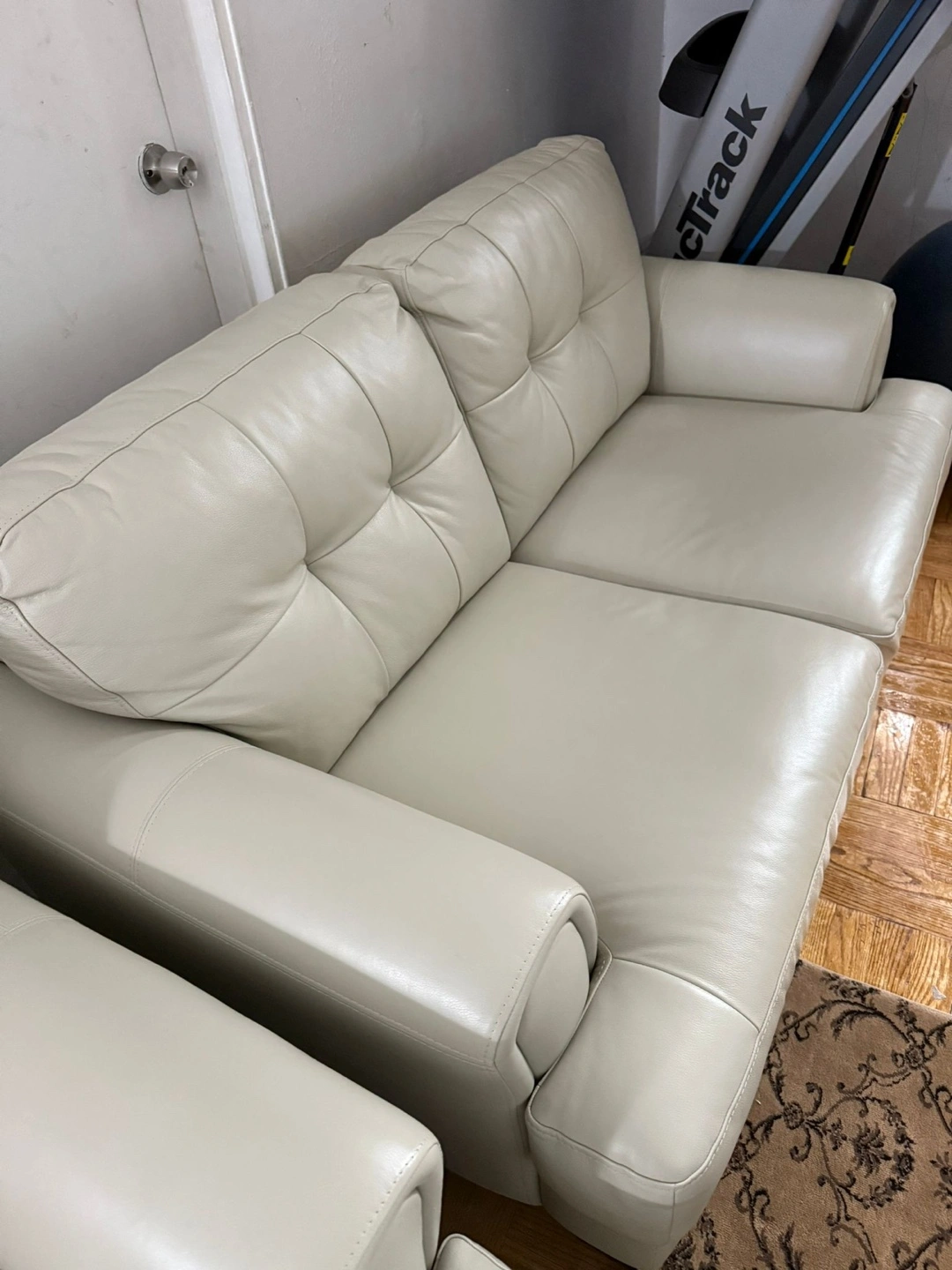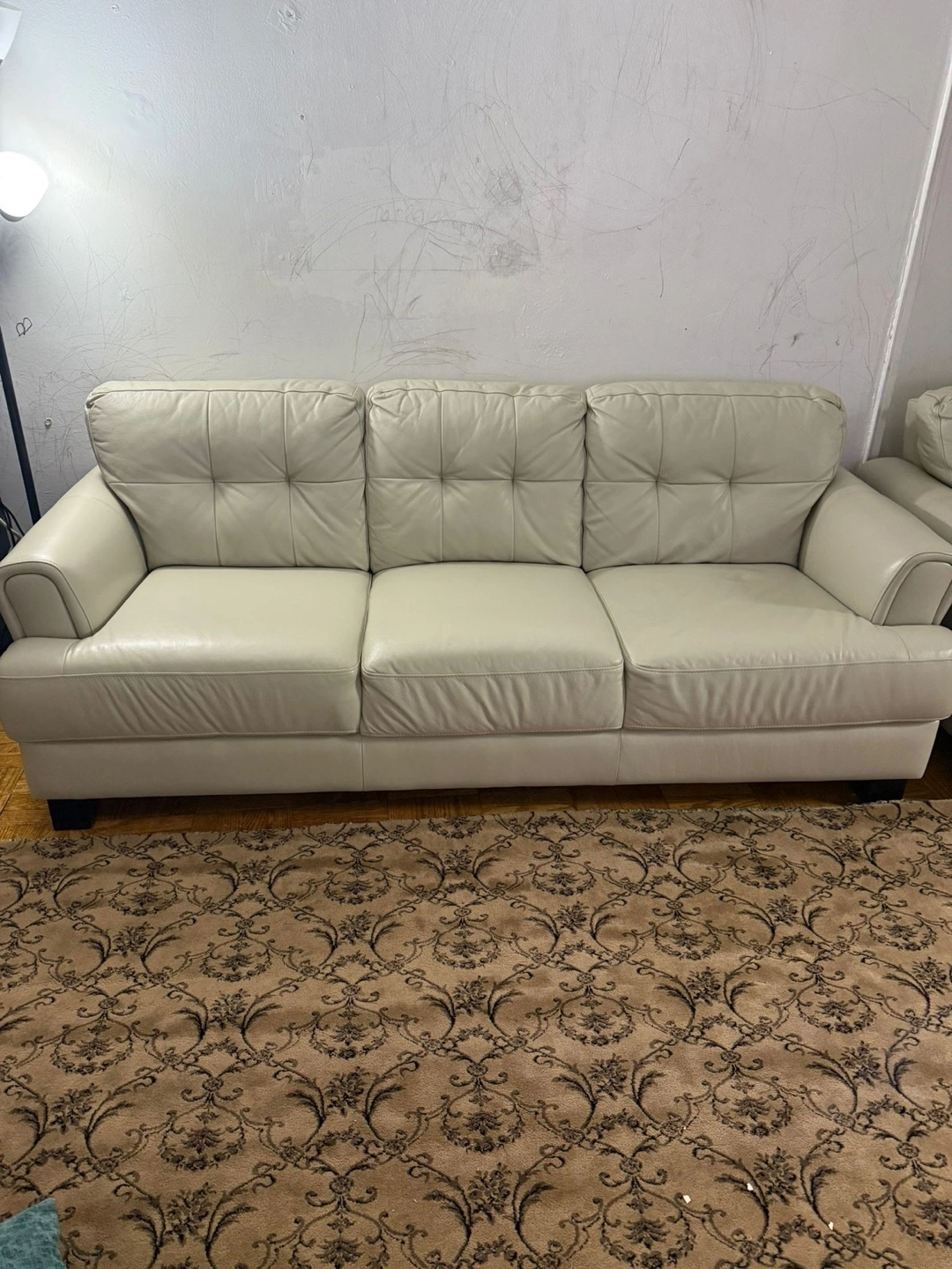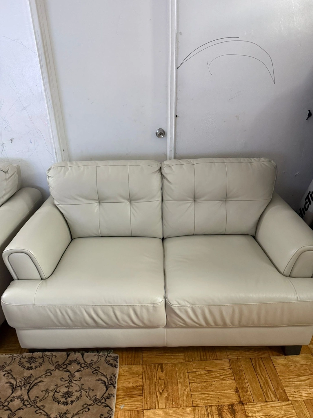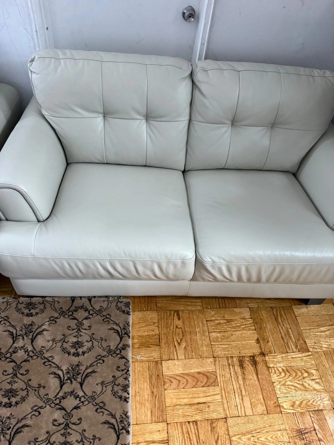 I'm selling a white leather sofa set. It's in great condition and would look great in any living room! It features a button-tufted back and sleek design. This set includes a three-seater sofa and a two-seater sofa.