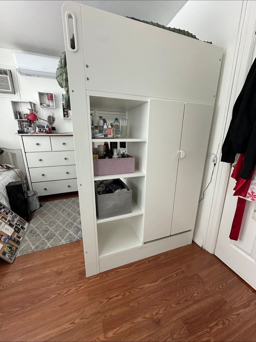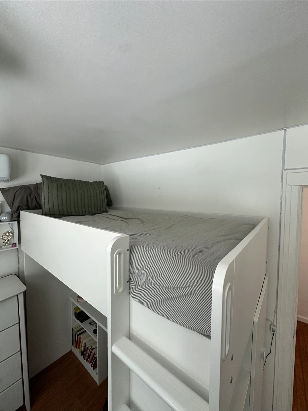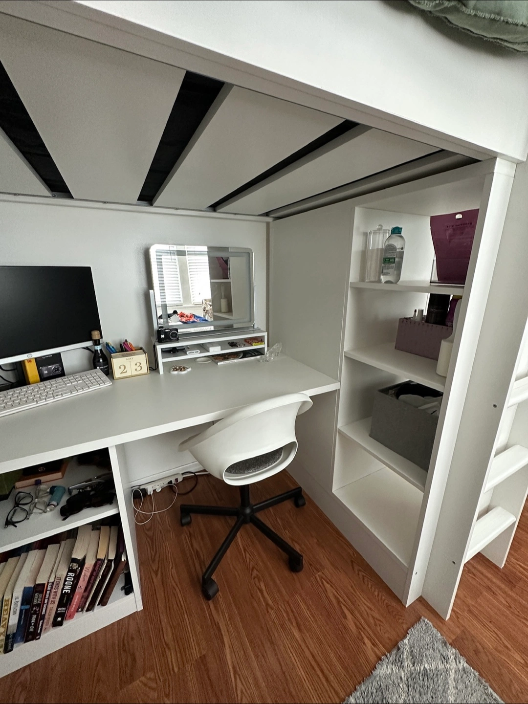 White loft bed structure. Features shelves, storage cabinets, and a built-in desk. Offers a great way to maximize space, creating a cozy haven for rest and work. Can include mattress and chair.