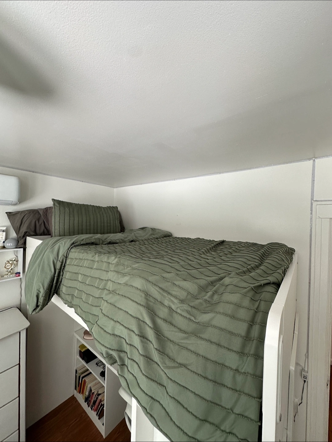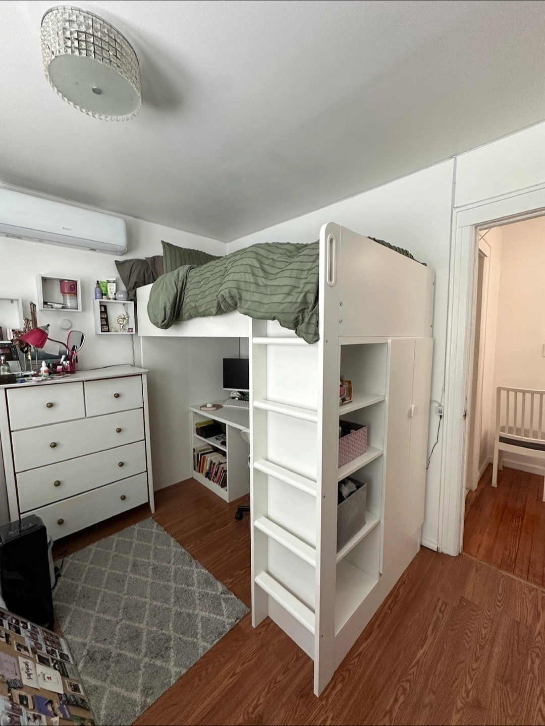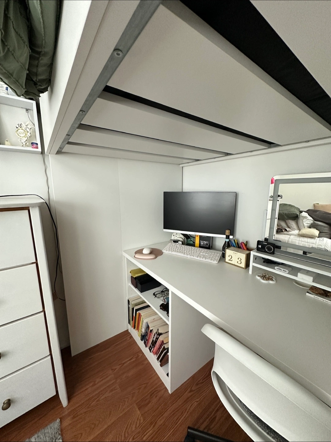 White loft bed structure. Features shelves, storage cabinets, and a built-in desk. Offers a great way to maximize space, creating a cozy haven for rest and work. Can include mattress and chair.