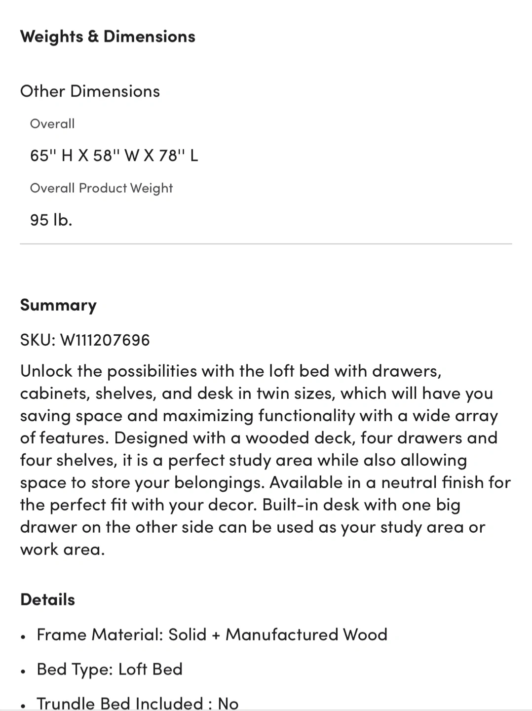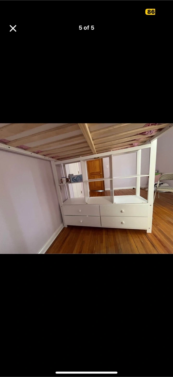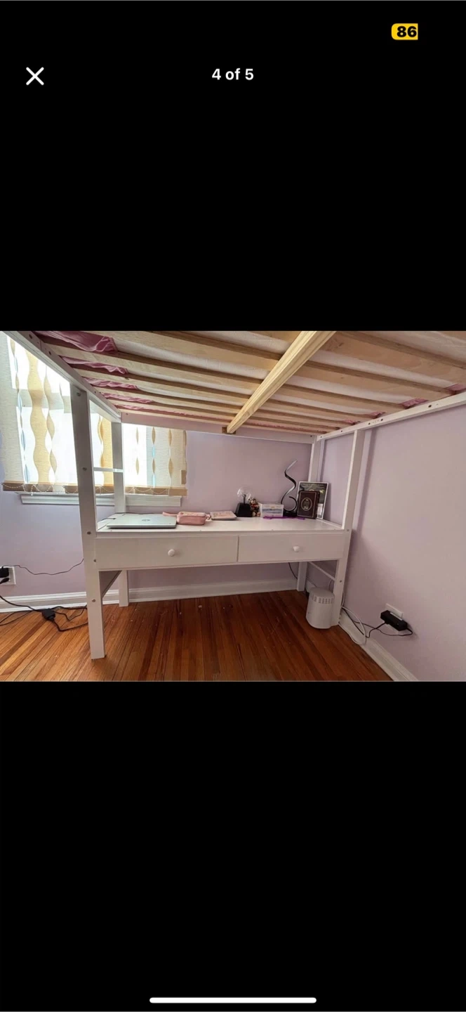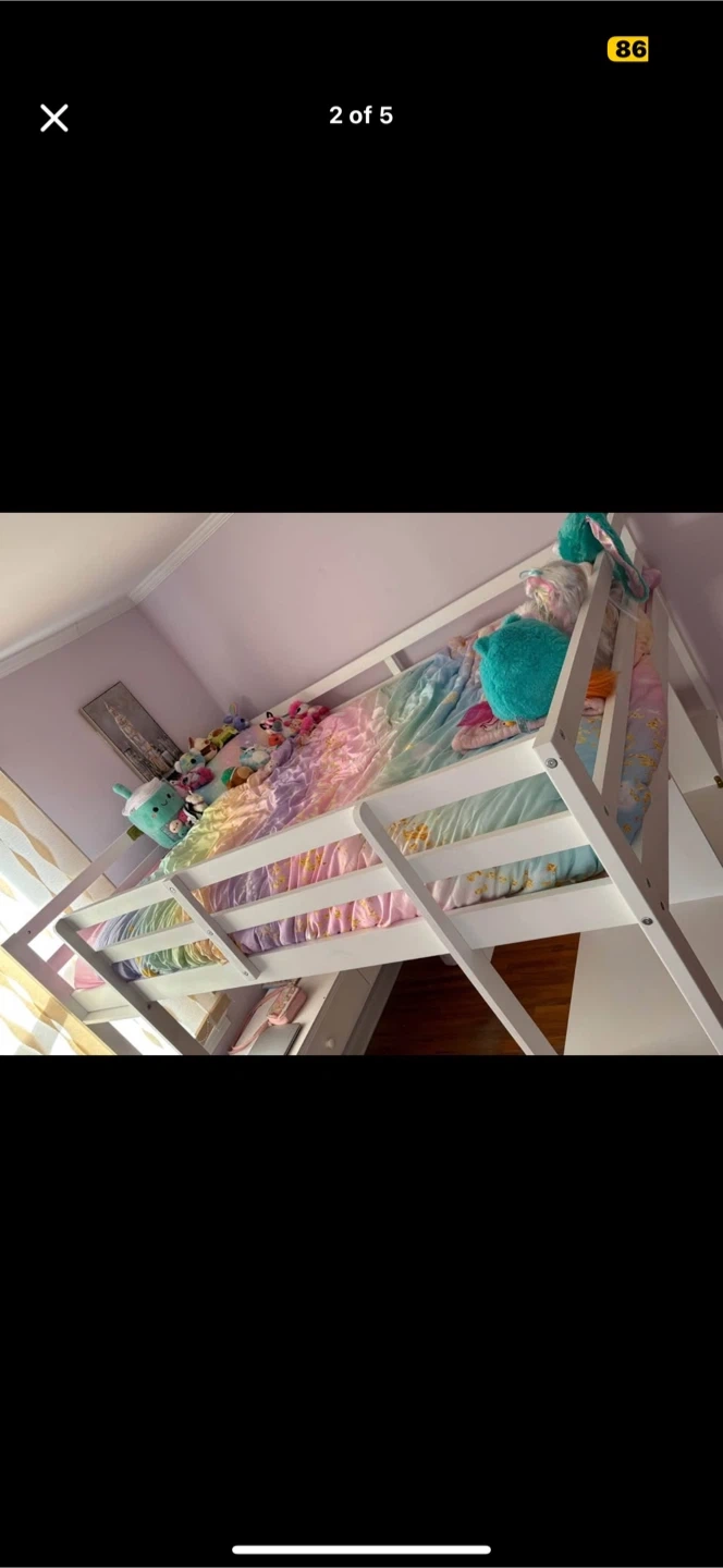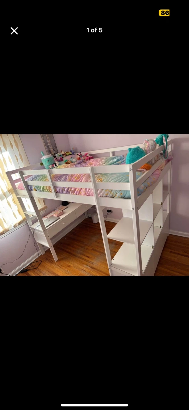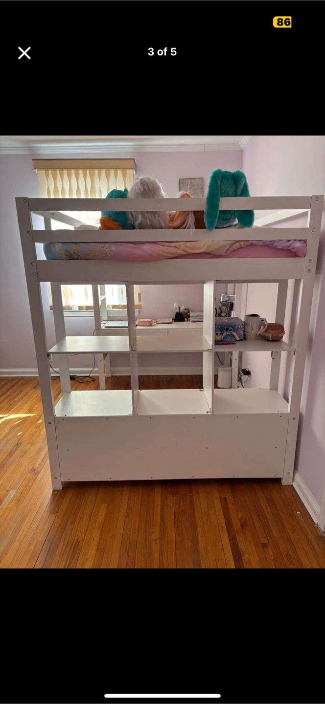 65Selling a white loft full sized bed that includes a built-in desk and storage shelves. It's a great space-saving solution for a kid's or teen's room! The bed is in good condition and ready for a new home!!! Mattress not included. Original price of this loft bed was $1000