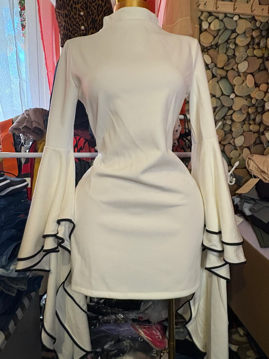 125Selling a cute white long sleeve dress with a unique design! It features a high neckline and flared sleeves with black trim. Perfect for a night out or a special occasion