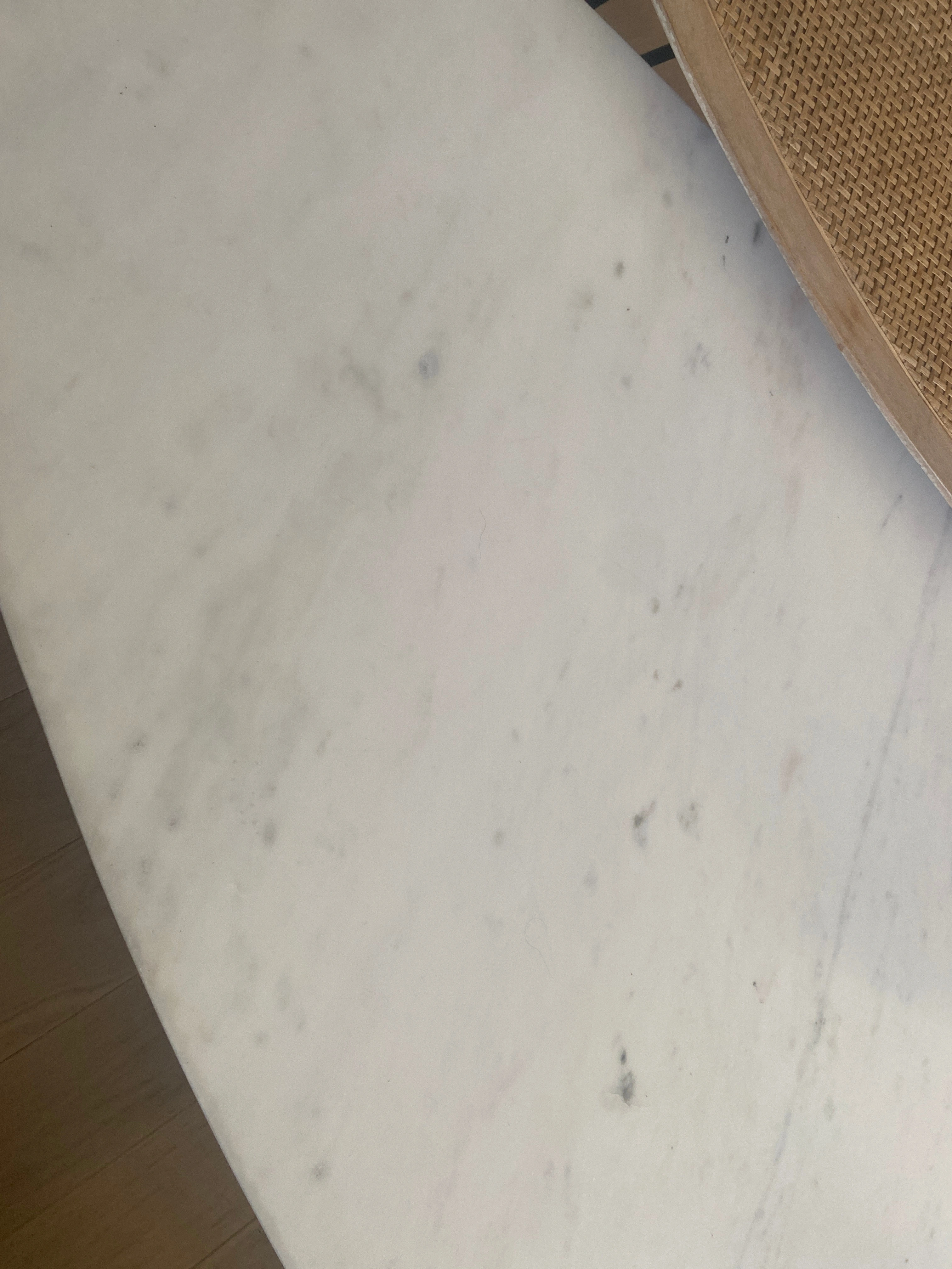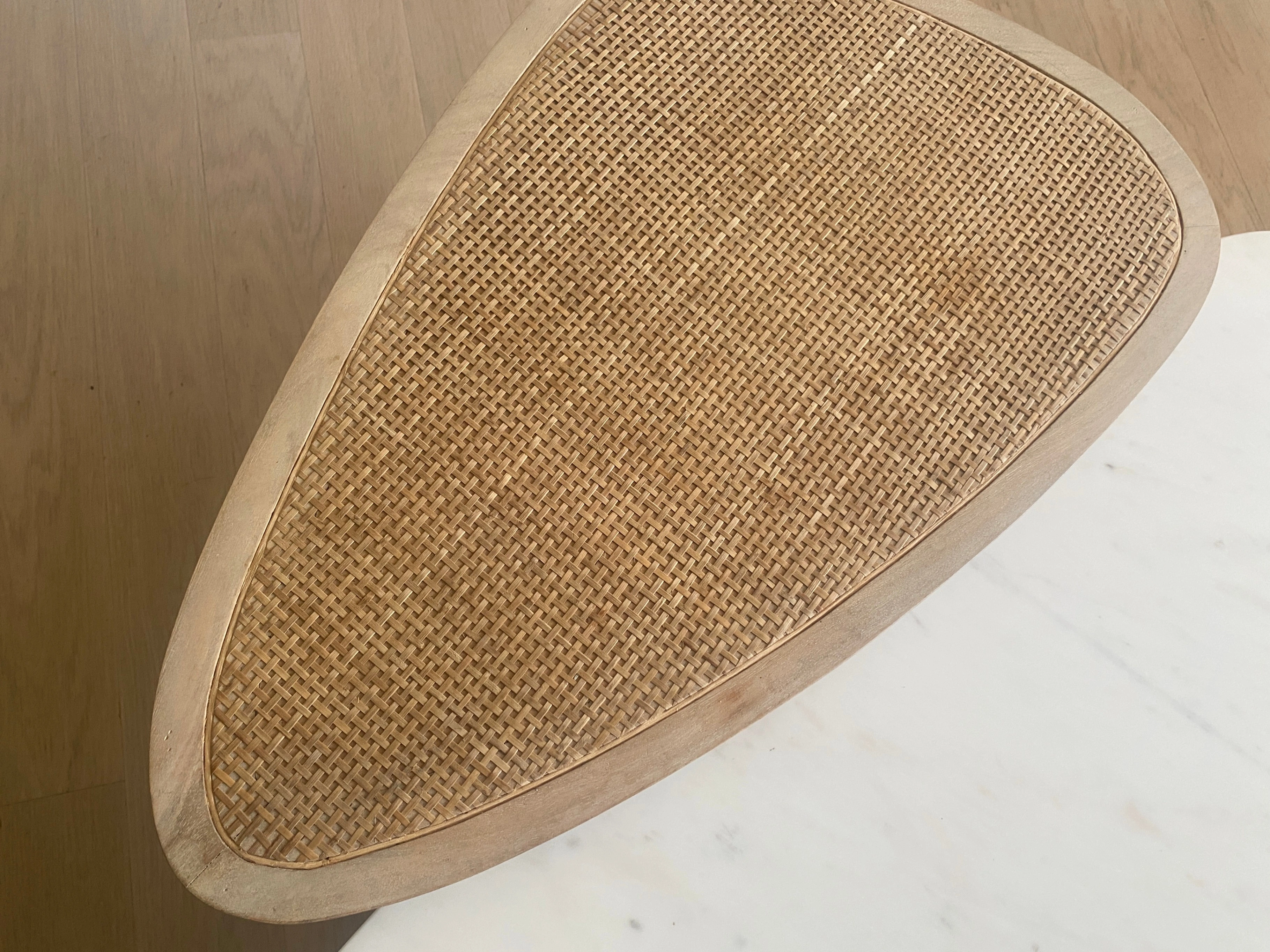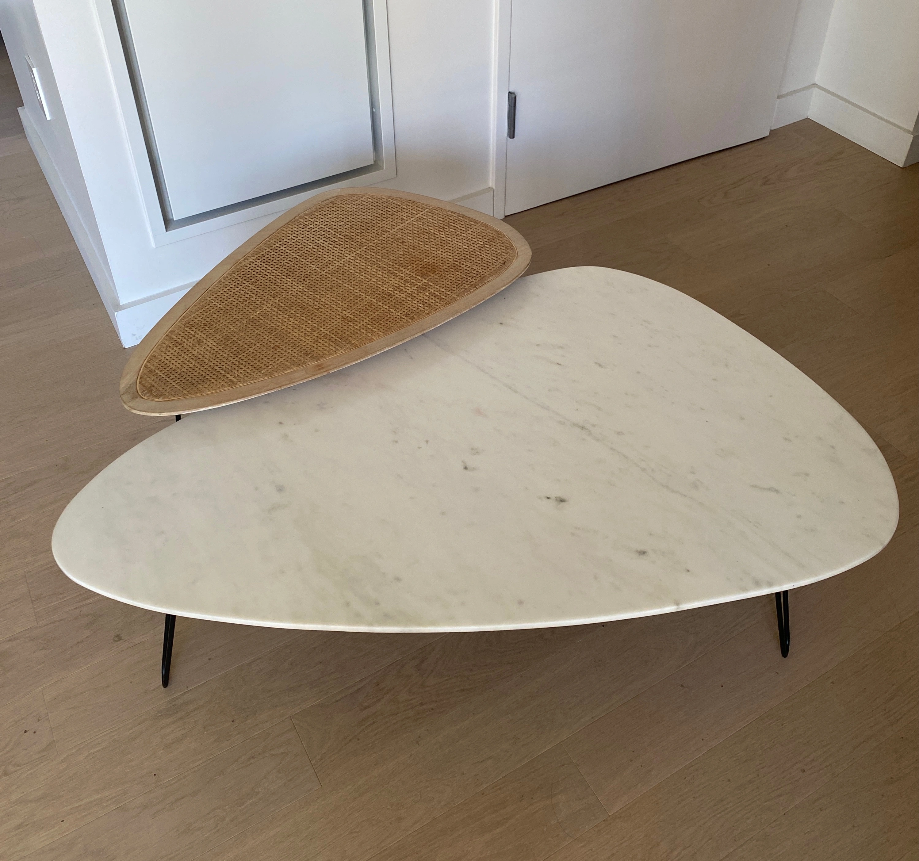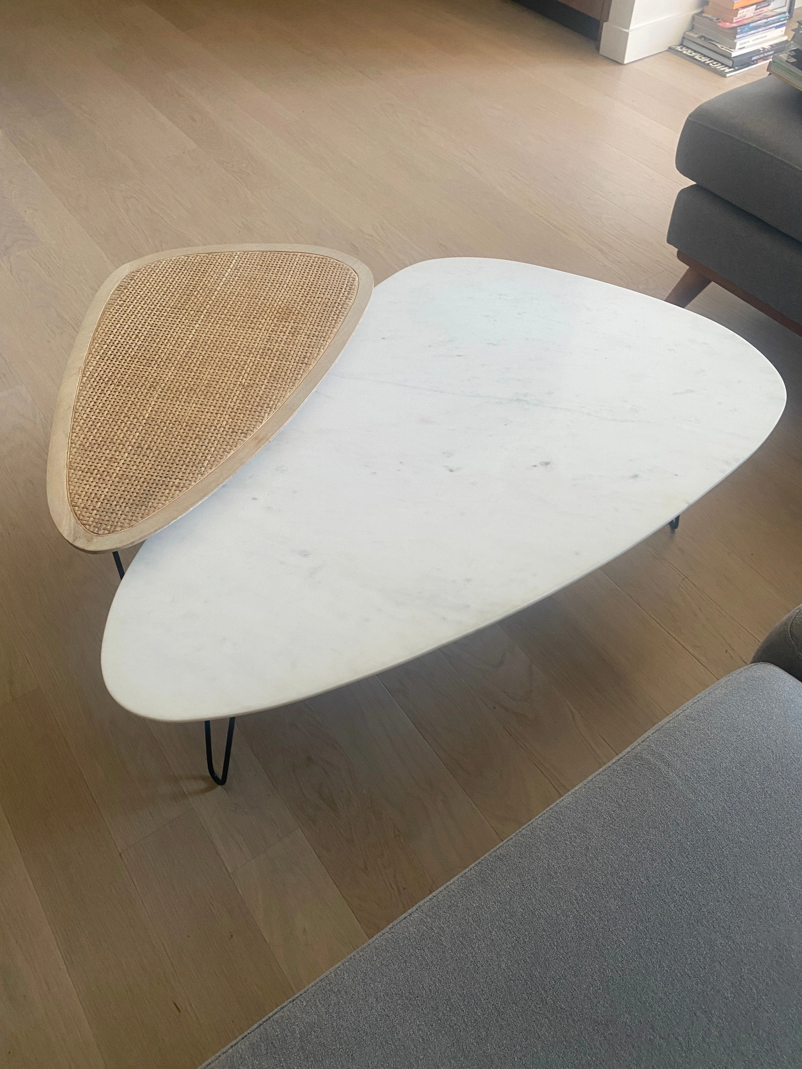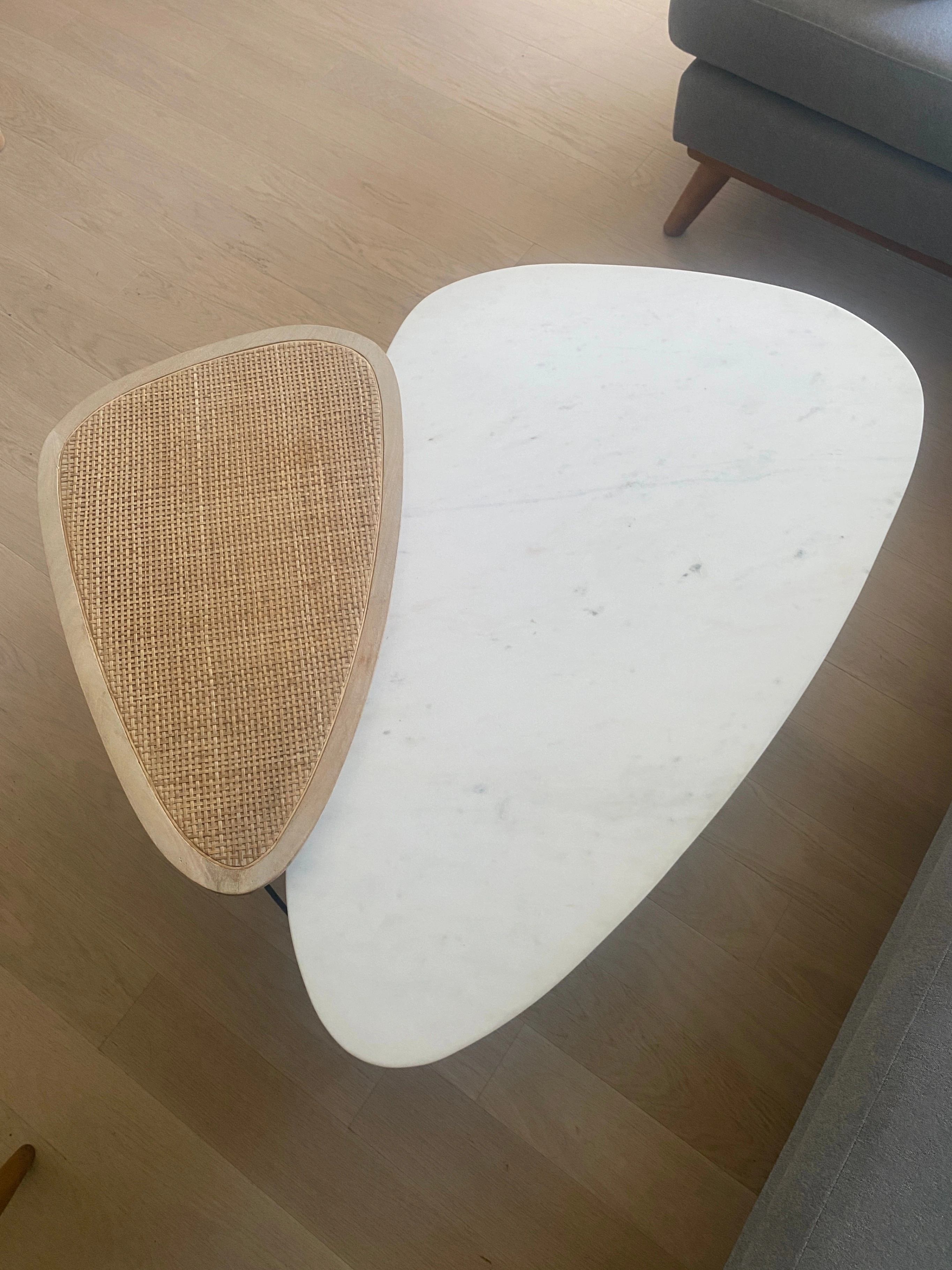 Nesting coffee tables, one marble and the other a wooden/woven top. Greenpoint pick up – or if you need a mover, I have a trusted contact that can help at an extra cost. Price dependent on distance. Marble table: about 44.5" W x 28.5" D x 15" H. Wooden table: about 29" W x 18" D x 16.5" H. Both in a rounded triangular shape that sits on black iron hairpin legs. Some small scratches on marble top, but not bad.