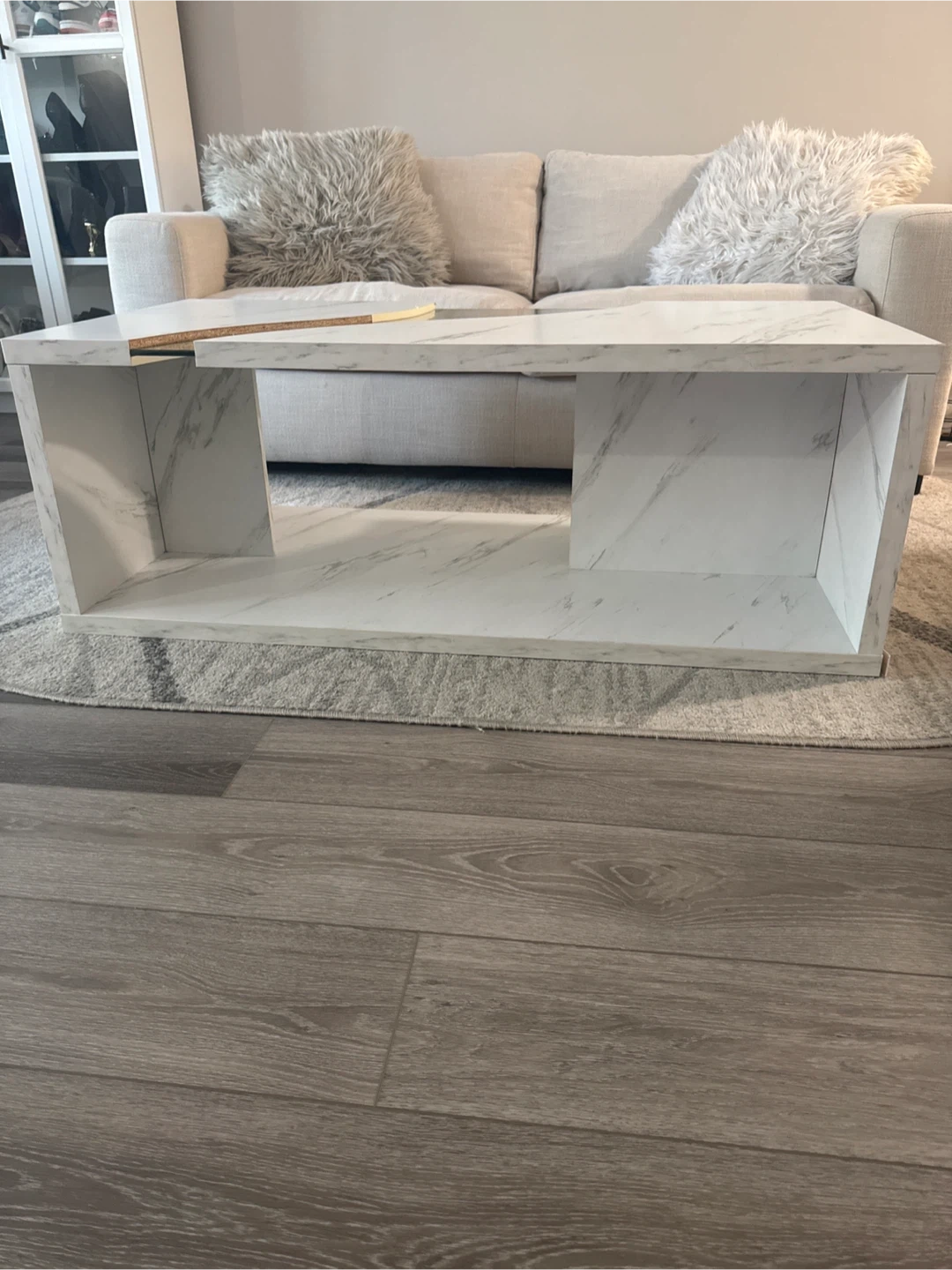 Selling a stylish coffee table with a white marble pattern. It has a modern design with open shelving, perfect for adding a touch of elegance to your living room!