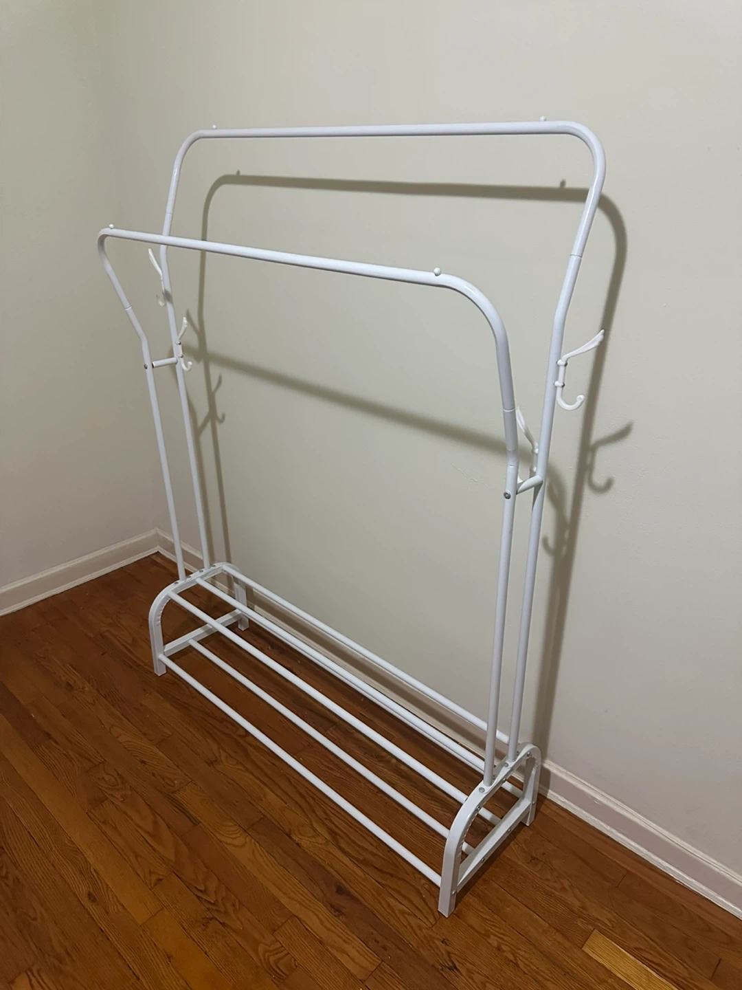 Selling a white metal clothes rack! It features a double-rail design for hanging clothes and a convenient shoe shelf at the bottom. Great for organizing your wardrobe and maximizing space. Pick up is only available in Leonia NJ
