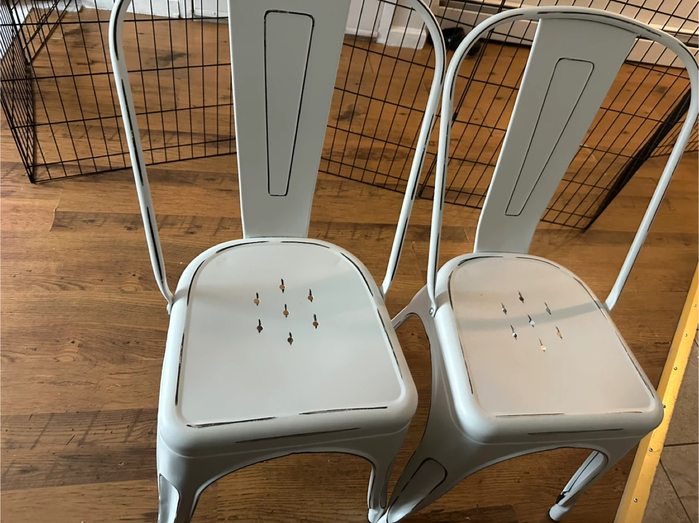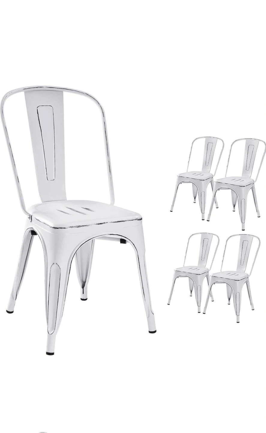 15Selling a set of four metal dining chairs in white. They have a cool, industrial look. Dimensions are approximately 17.3" wide, 17.5" deep, and 18.1" high to the seat, with a total height of 33". Each chair can support up to 340lbs