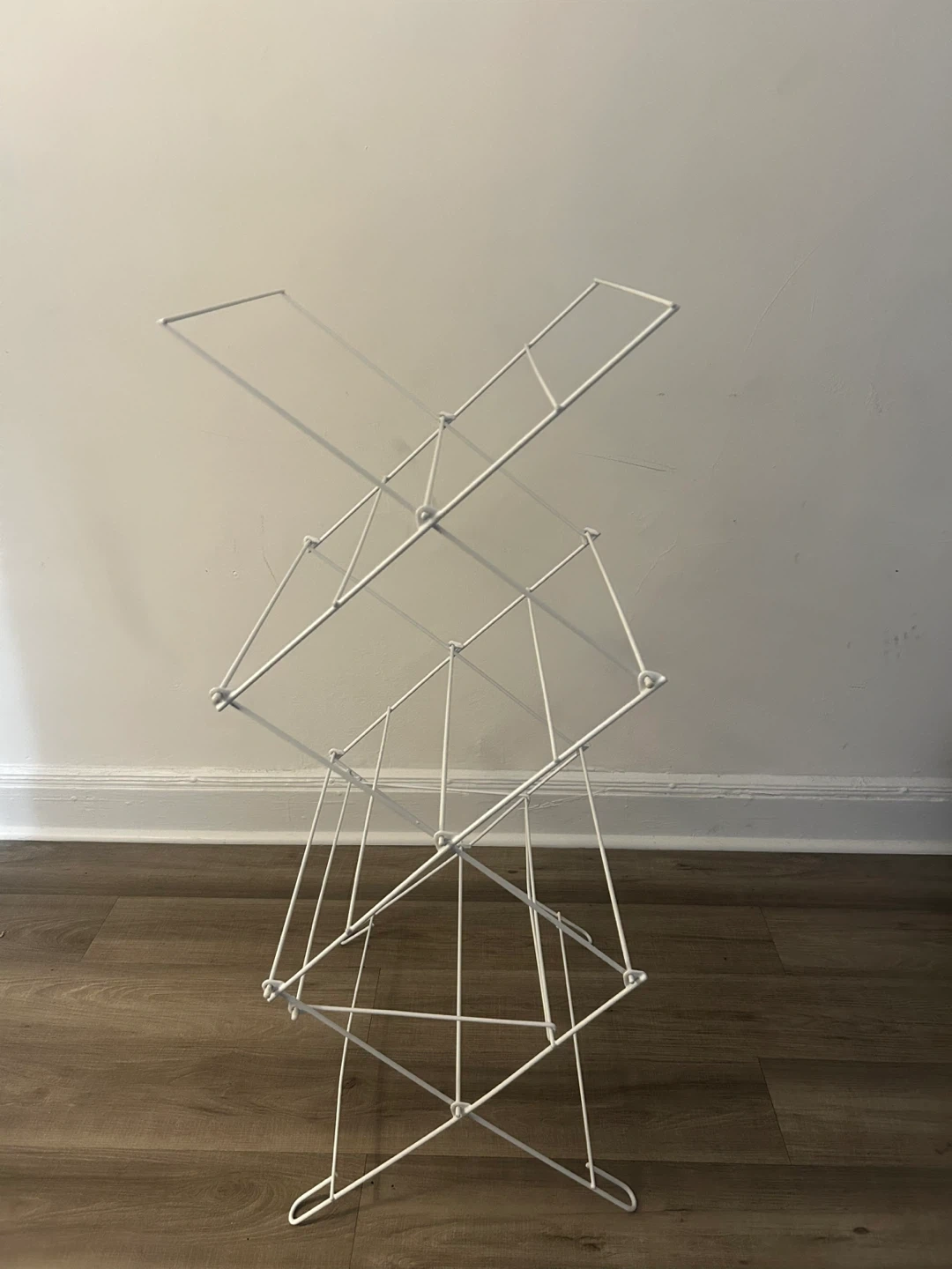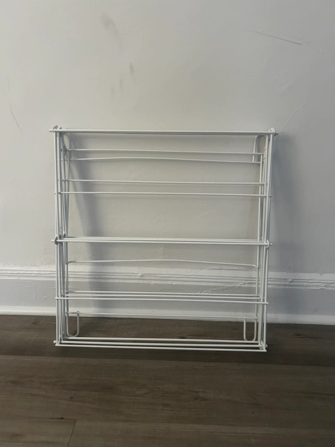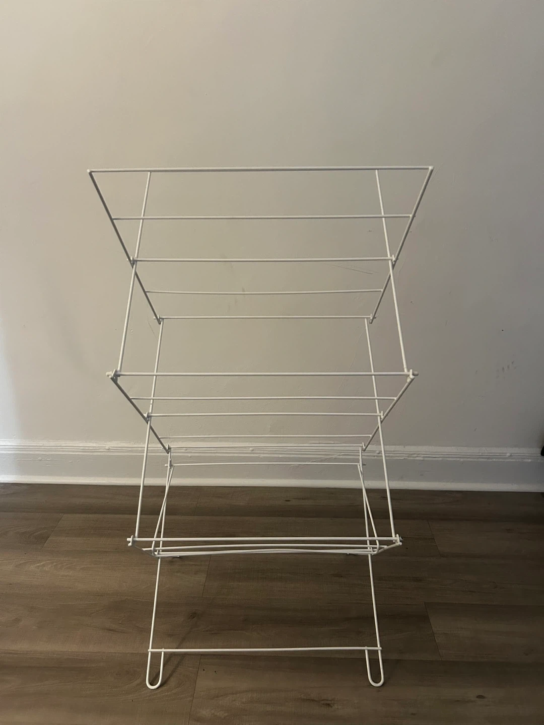 Here's a white metal folding clothes drying rack. It's perfect for saving space when you're not using it. It has three tiers.