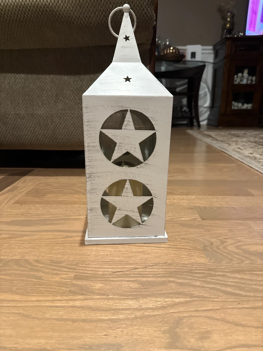 This is a cute white metal lantern with star cutouts. It comes with a candle inside. The lantern has a timer and uses batteries