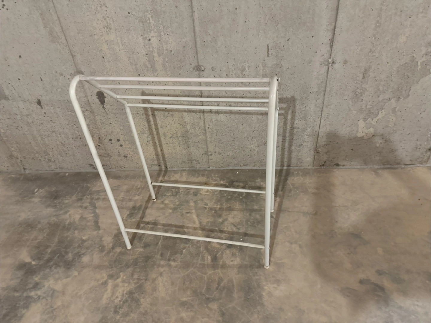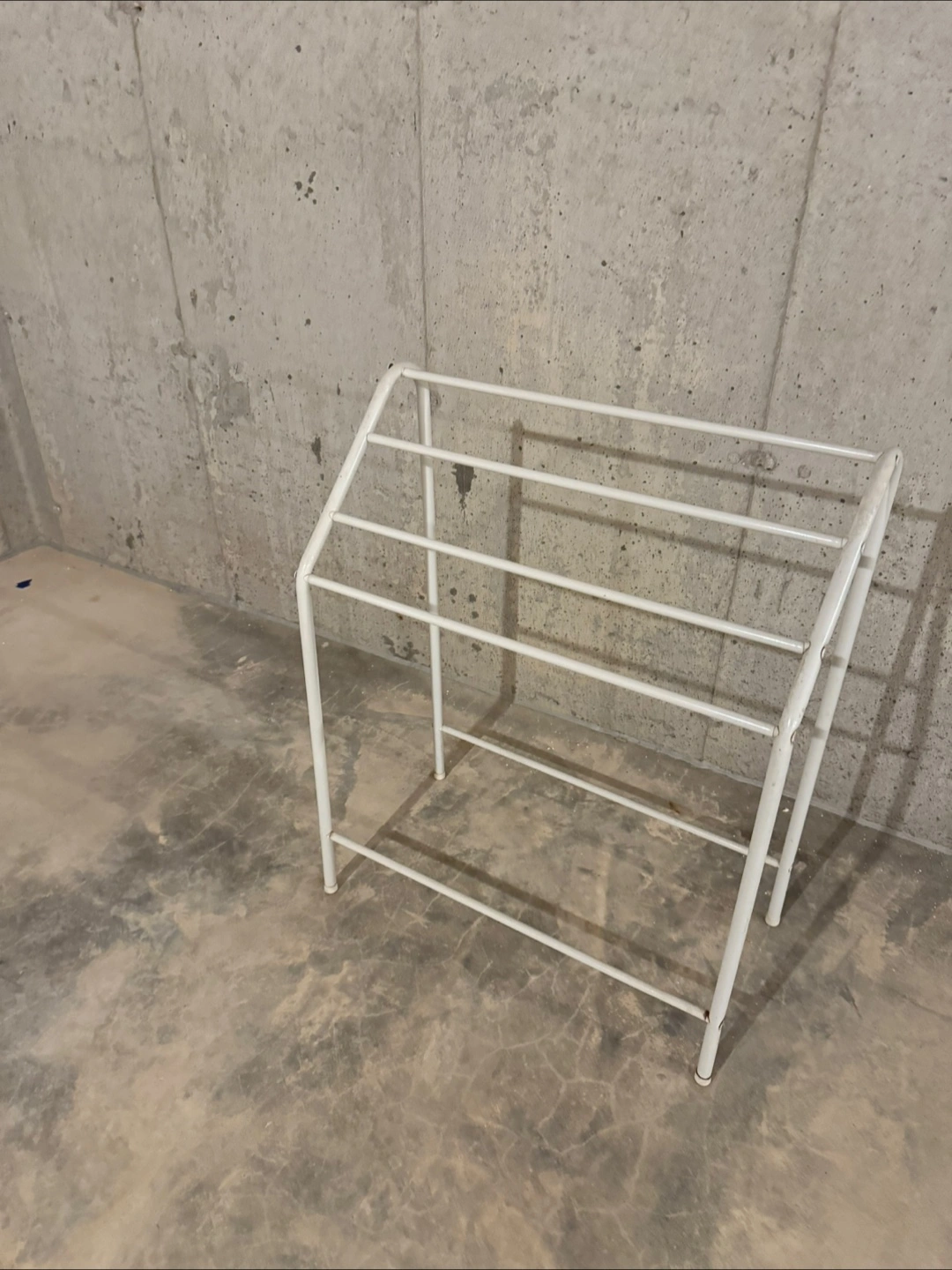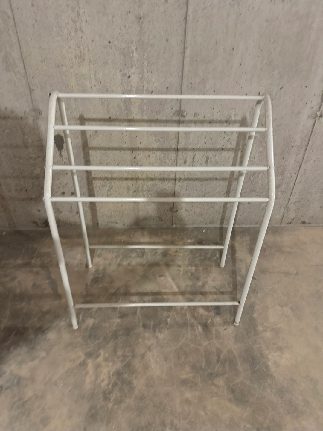 52Here's a simple white metal towel rack! It's in good condition and ready to hold your towels. Perfect for adding a little extra storage to your bathroom or laundry room