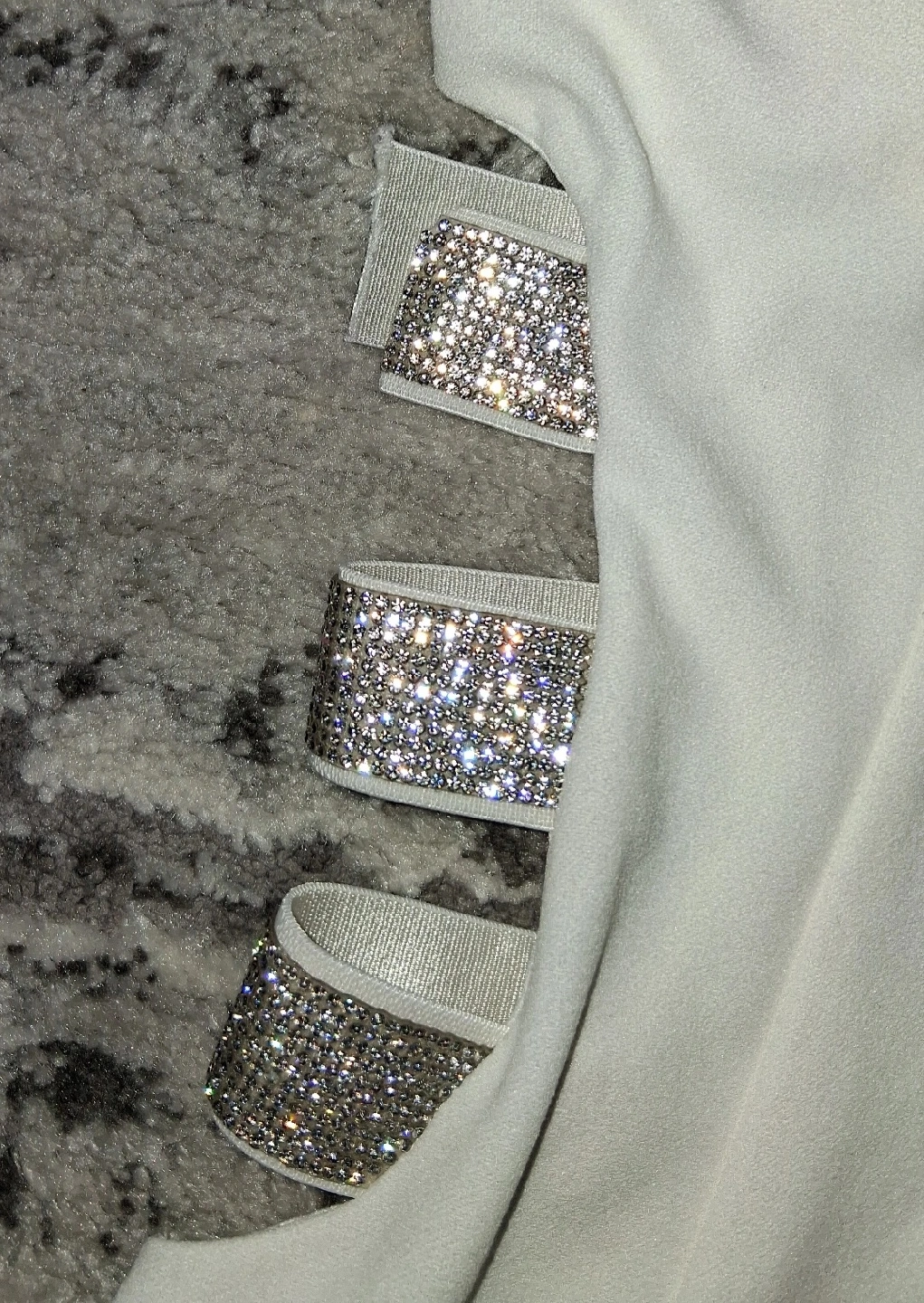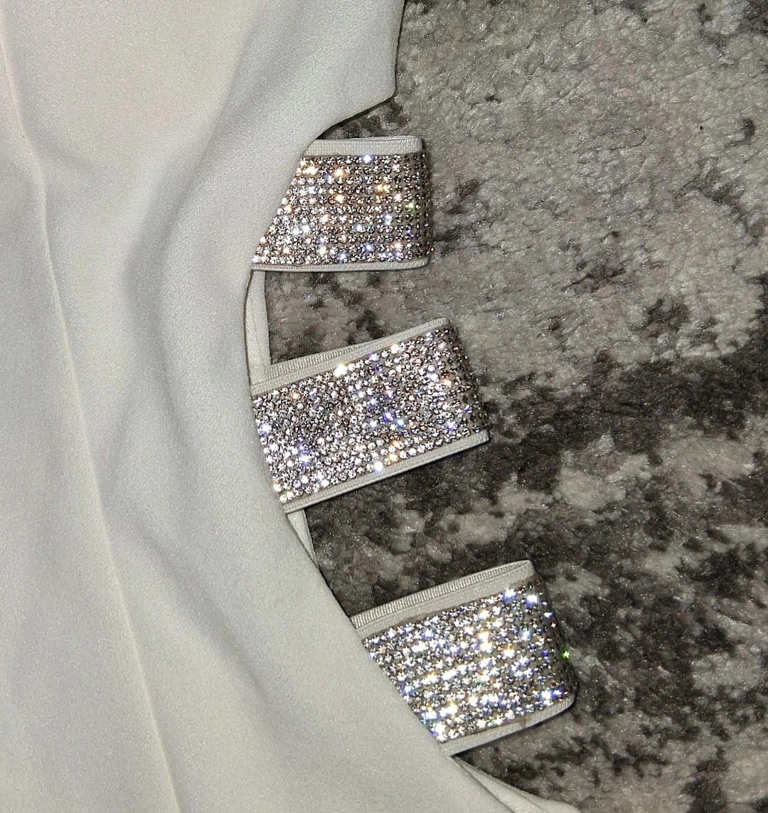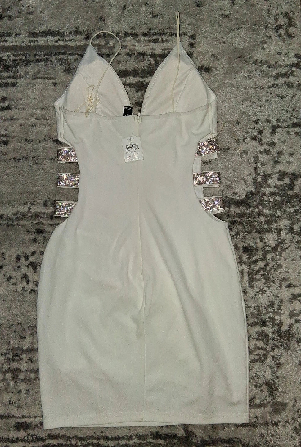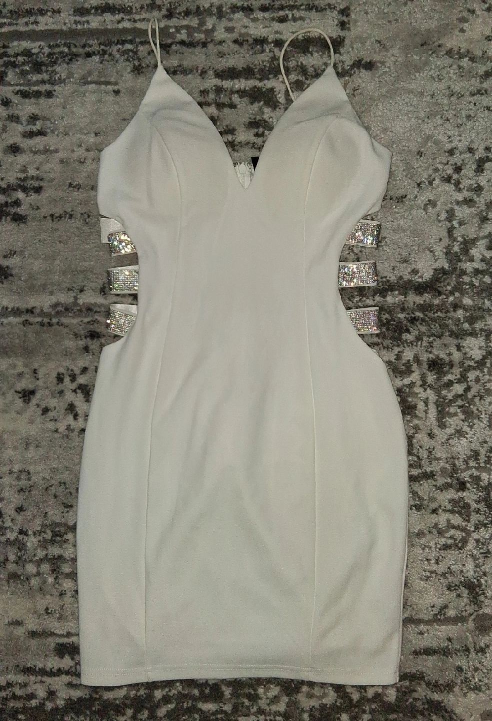 Cute white mini dress with rhinestone detailing on the sides! Perfect for a night out or special occasion