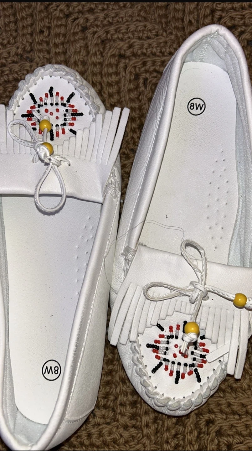 Selling a pair of white moccasins in size 8W. They have a beaded design and fringe. Perfect for adding a unique touch to your outfit!