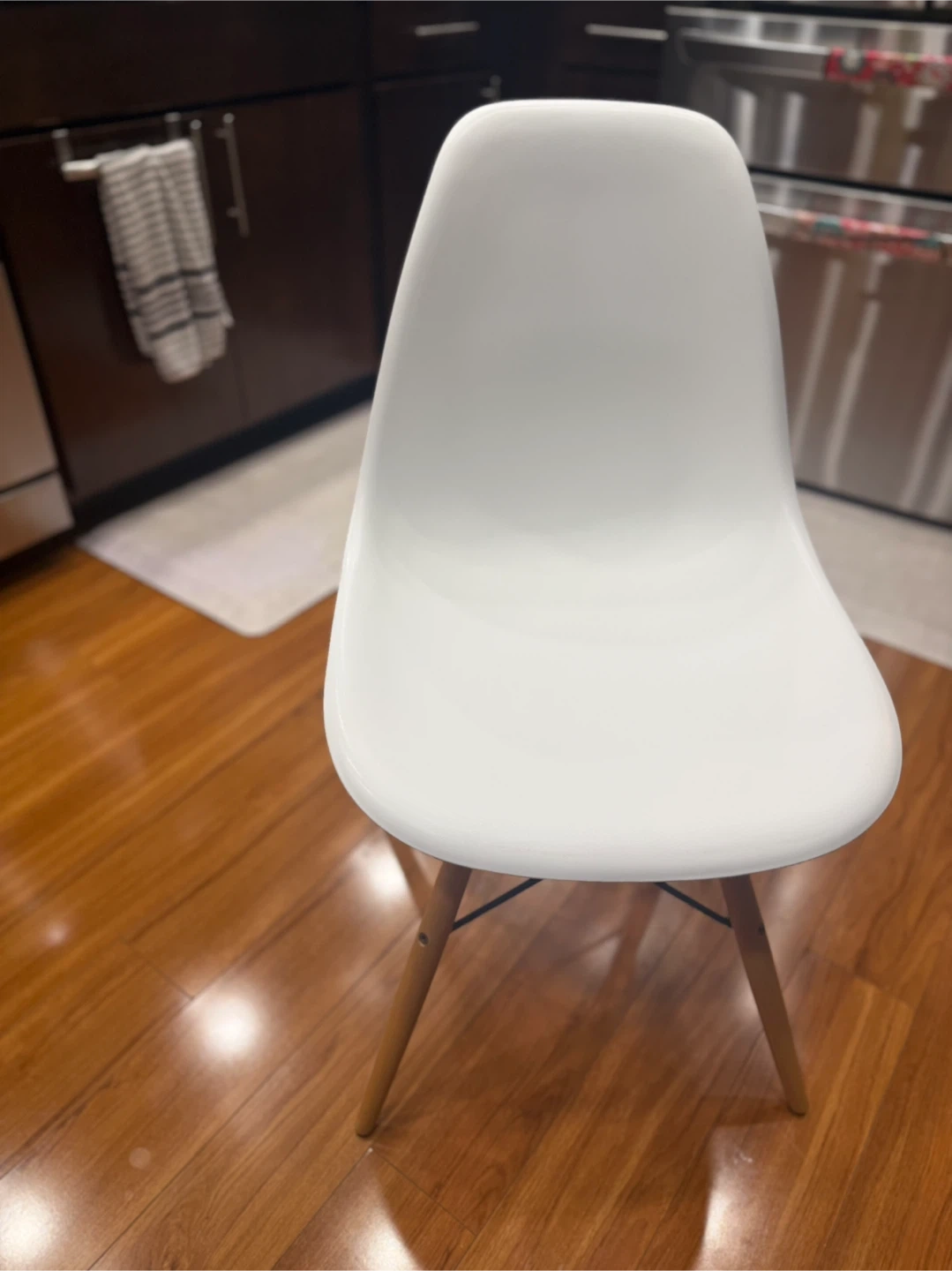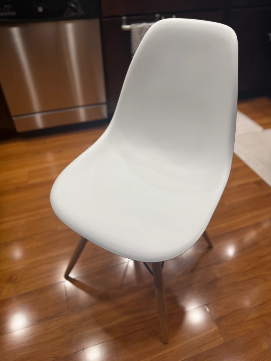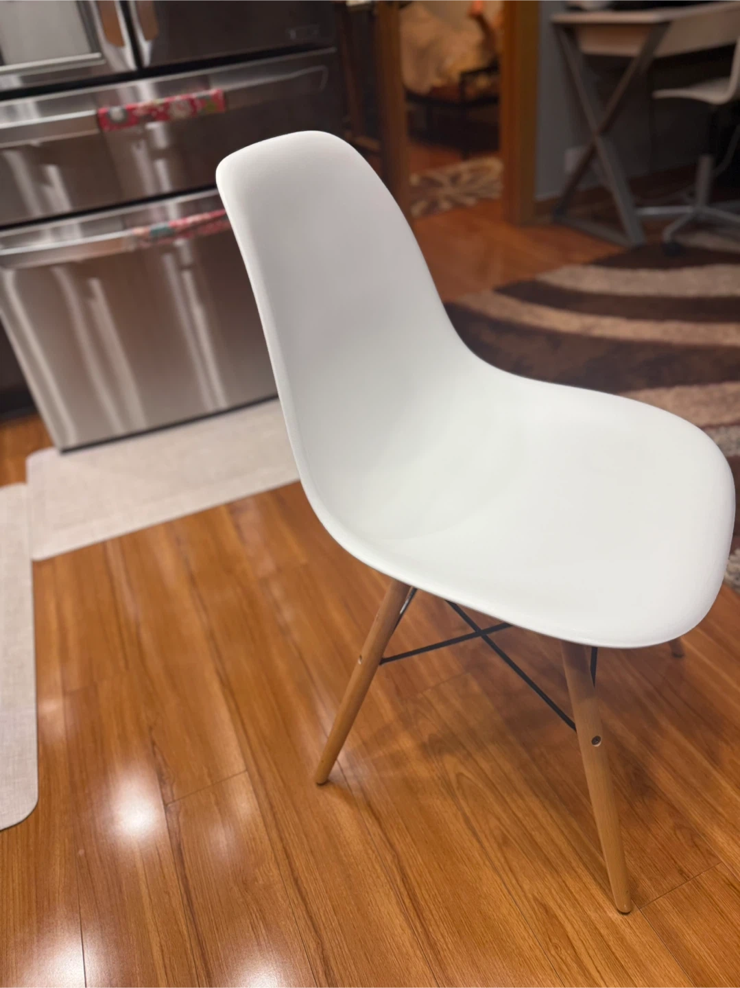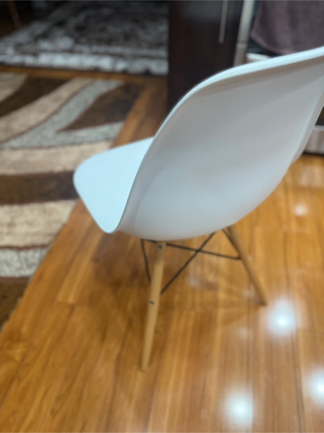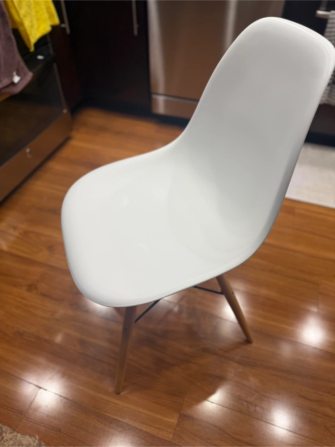18Selling a modern-style dining chair! It's a simple, clean design with a white molded plastic seat and wooden legs. Perfect for adding a touch of contemporary style to your dining area or any room in your home