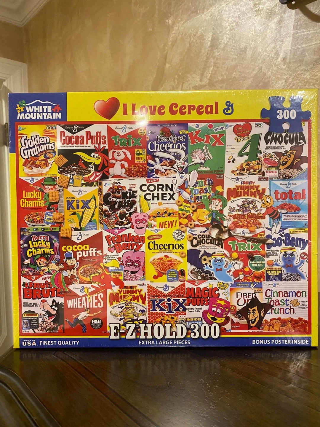 15Selling a White Mountain 300-piece puzzle titled "I Love Cereal"! It features a collage of classic cereal boxes like Cocoa Puffs, Trix, and Lucky Charms. The puzzle has extra large pieces and includes a bonus poster inside