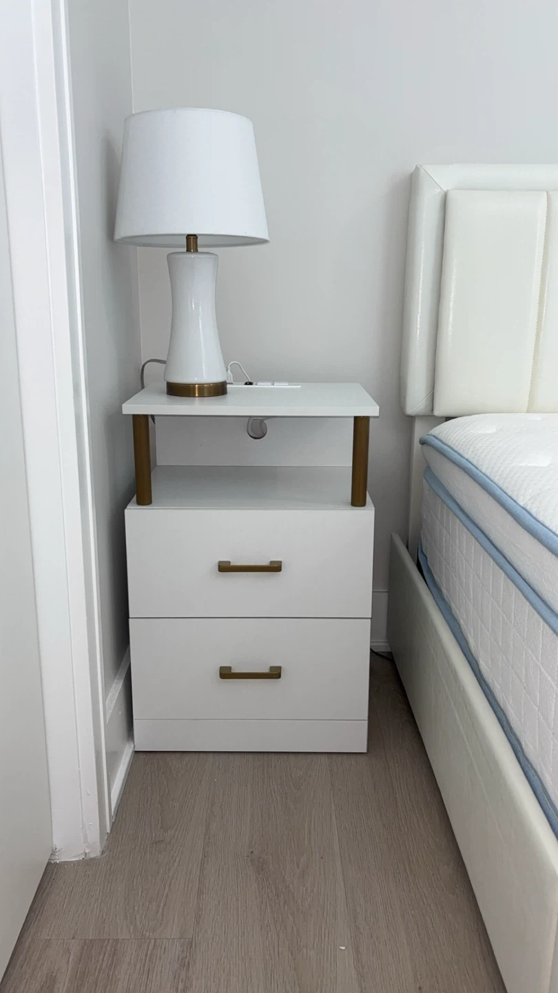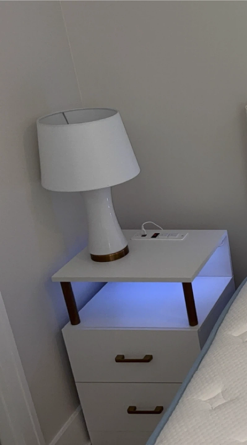 Selling a white nightstand that's in great condition! It features two drawers and a built-in USB port and outlets on top, perfect for charging your devices overnight. The nightstand also has a shelf with LED lighting underneath, adding a nice ambiance to your bedroom. Smoke free apartment. Only a year old. Need gone by 10/11
