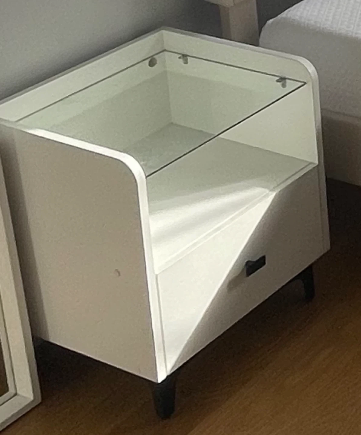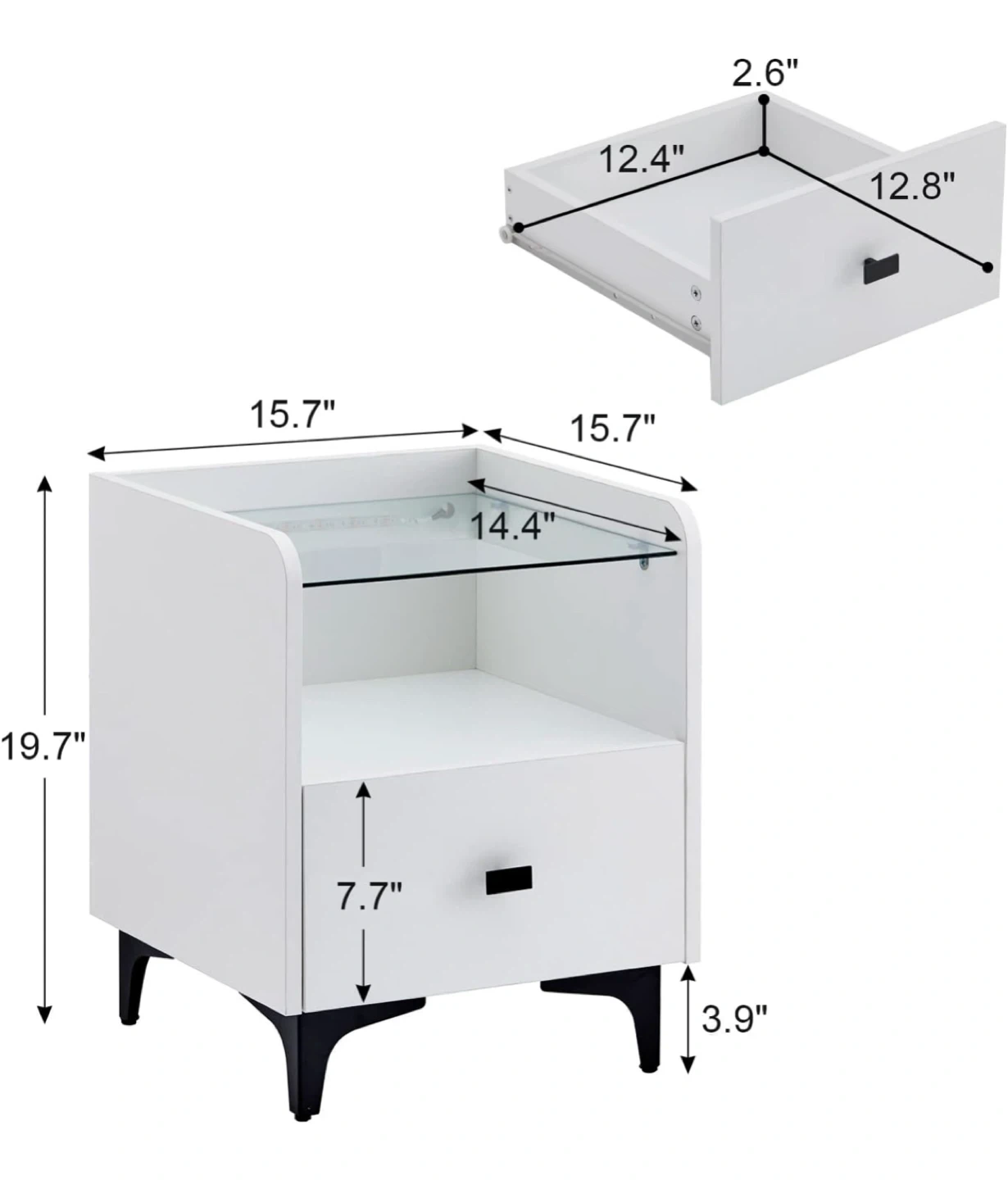 Cute white nightstand! It has a glass top and a drawer for storage. The dimensions are approximately 19.7" high, 15.7" wide, and 15.7" deep. The drawer is about 7.7" tall and 12.4" wide. It's in great condition