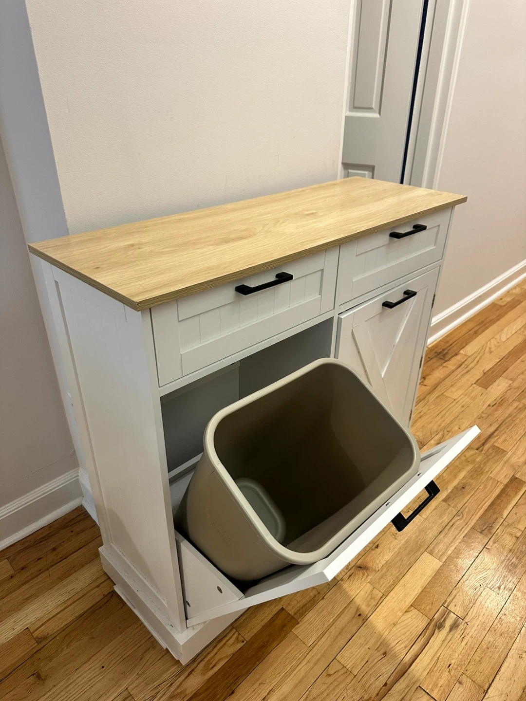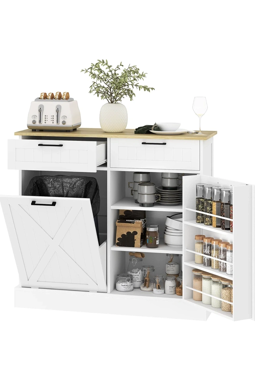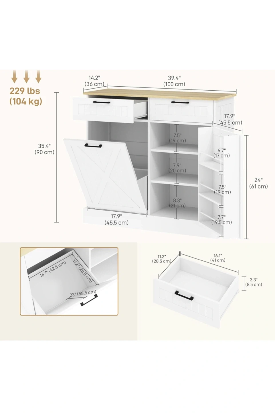 This kitchen island/storage cabinet is perfect for adding extra storage and counter space to your kitchen. It features a white cabinet with an oak-colored top, two drawers, and a tilt-out trash bin. There's also shelving on the side for spices and other kitchen essentials! The dimensions are approximately 39.4" (100 cm) wide, 24" (61 cm) high, and 14.2" (36 cm) deep.